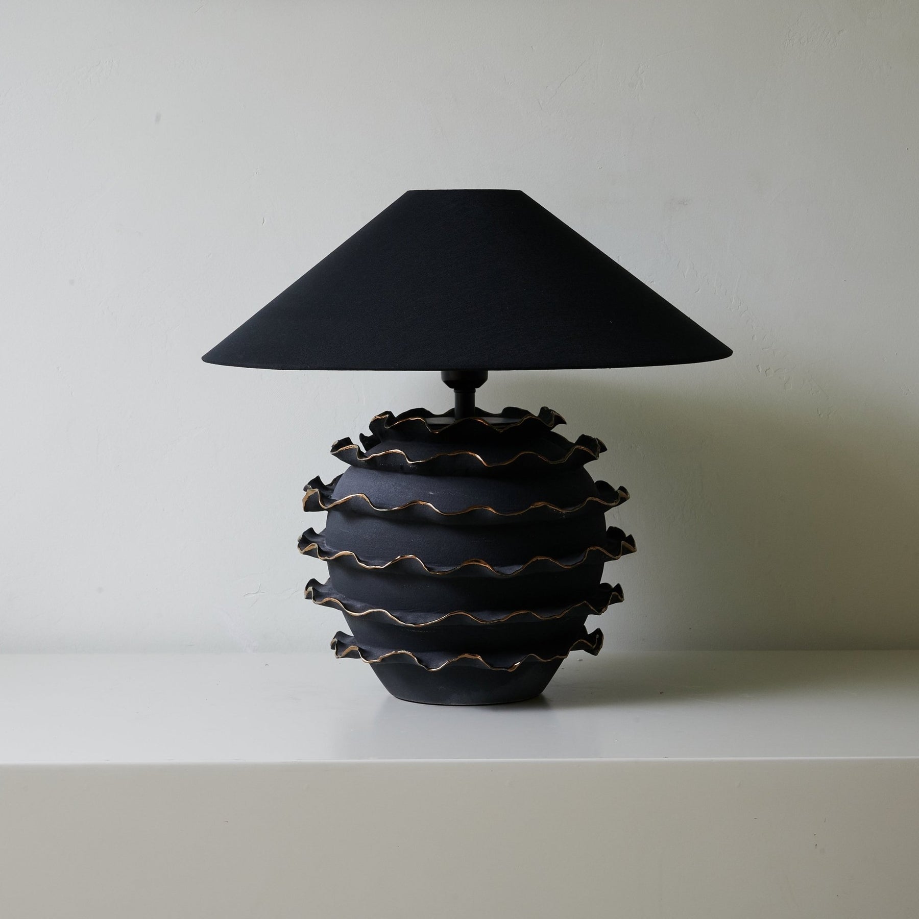 The Eclipse Ruffle Table Lamp by Vakkerlight showcases dramatic texture and bold contrasts. Its handcrafted ceramic base features a series of sculptural, rippling ridges finished in matte black with subtle golden accents, paired elegantly with a sleek black conical fabric shade. Perfect for adding a statement piece to modern, eclectic, or artistic interiors, it delivers a warm, ambient glow with a distinctly contemporary edge.rn, industrial, or contemporary interiors, adding dramatic flair with a warm, focused glow.