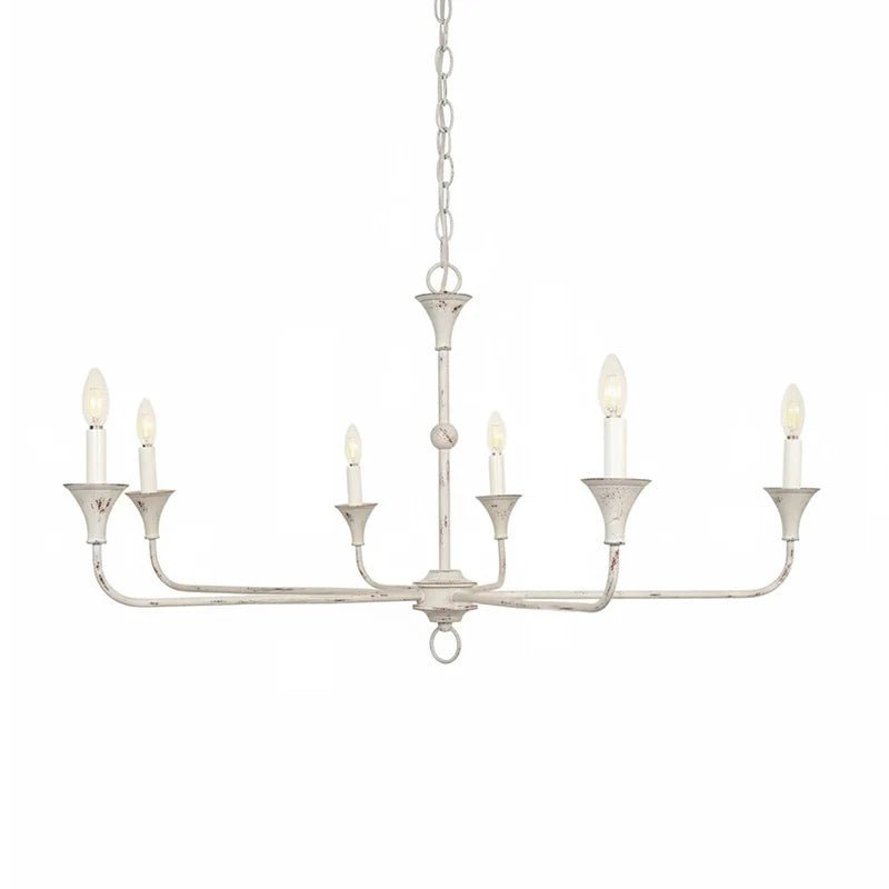 The metal surface is finished with a painted coating that gives the chandelier a subtly textured, hand-applied look. Rather than a perfectly smooth, sanded finish, the surface may display a soft, sponge-like texture that adds a touch of organic character. This artisanal finish complements the fixture’s fluid profile, bringing timeless elegance and architectural poise to any interior.