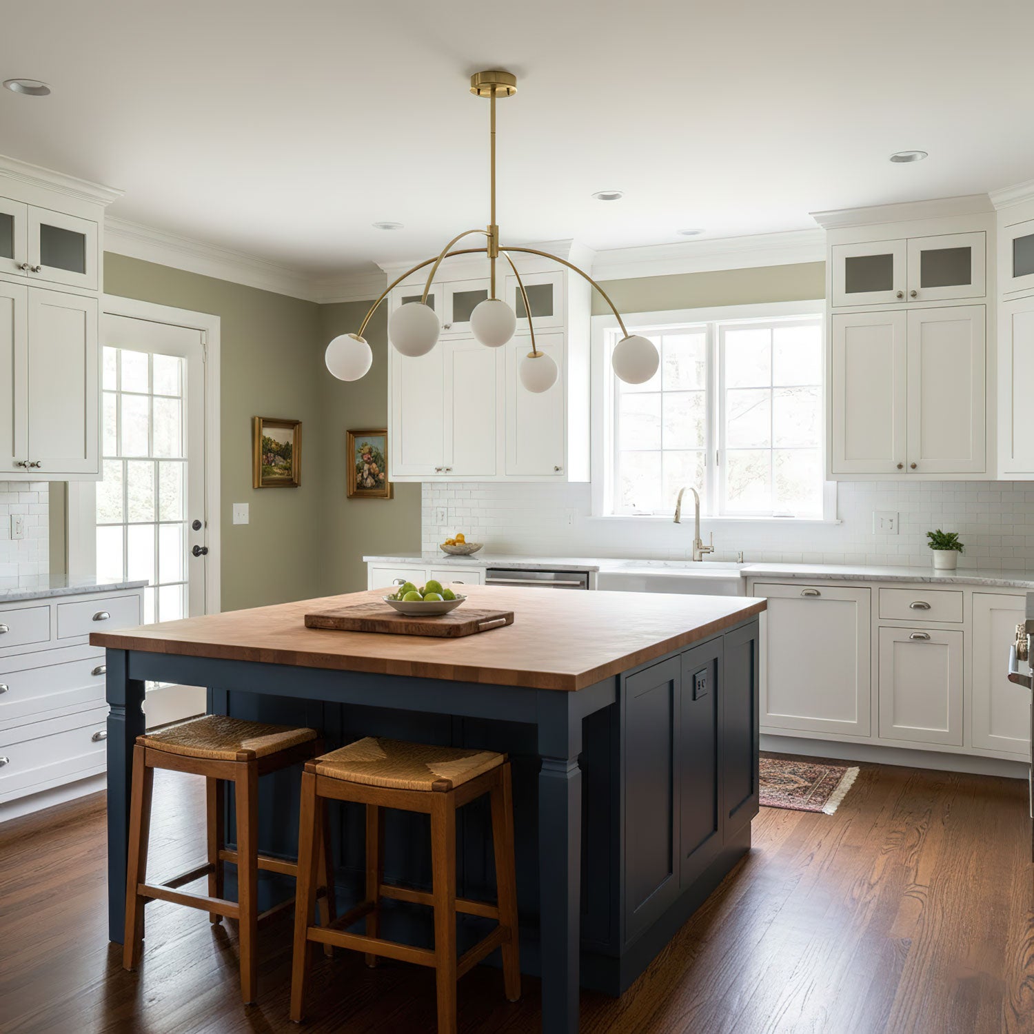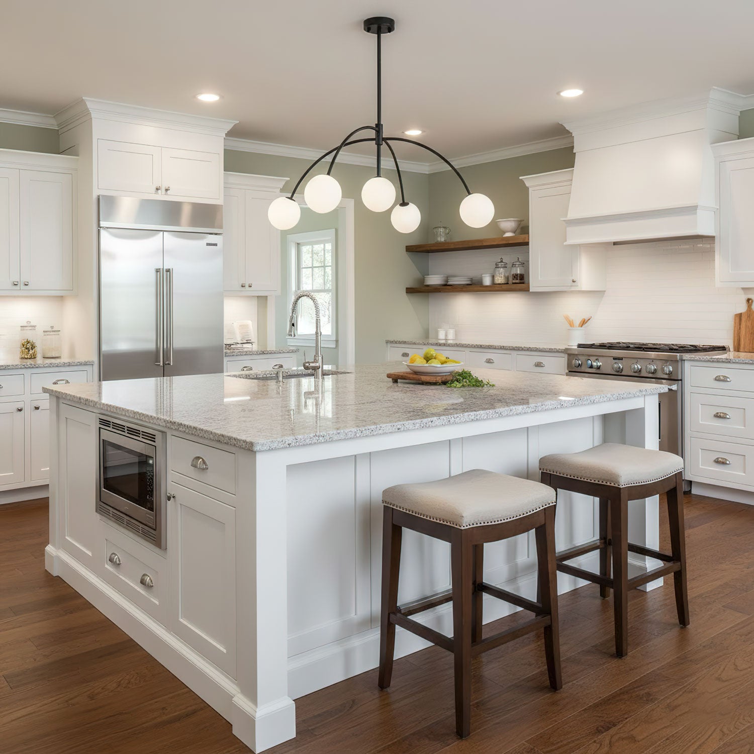 Pendants Over Island: These provide crucial task lighting for food prep and should hang 32-36 inches above the surface. Make sure that each pendant is about 1/4 the length of the island to provide sufficient coverage without overwhelming the space.