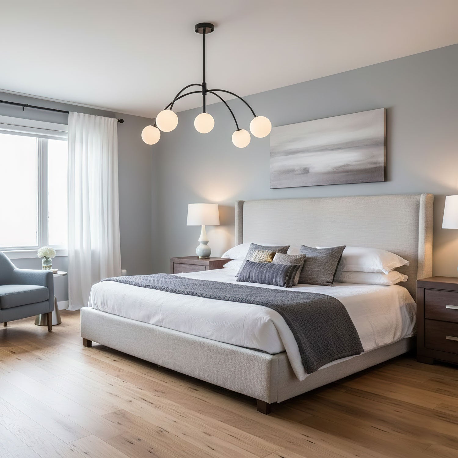 Ceiling Fixtures: Bedrooms benefit from soft, ambient lighting. Use the room dimension formula to ensure the ceiling fixture is properly scaled. Semi-flush or flush mounts work well for general lighting, while sconces or bedside lamps provide focused task lighting.