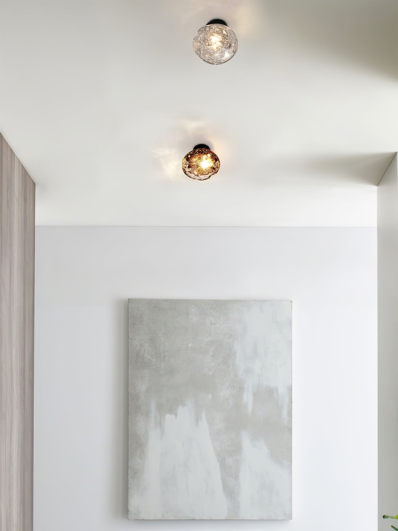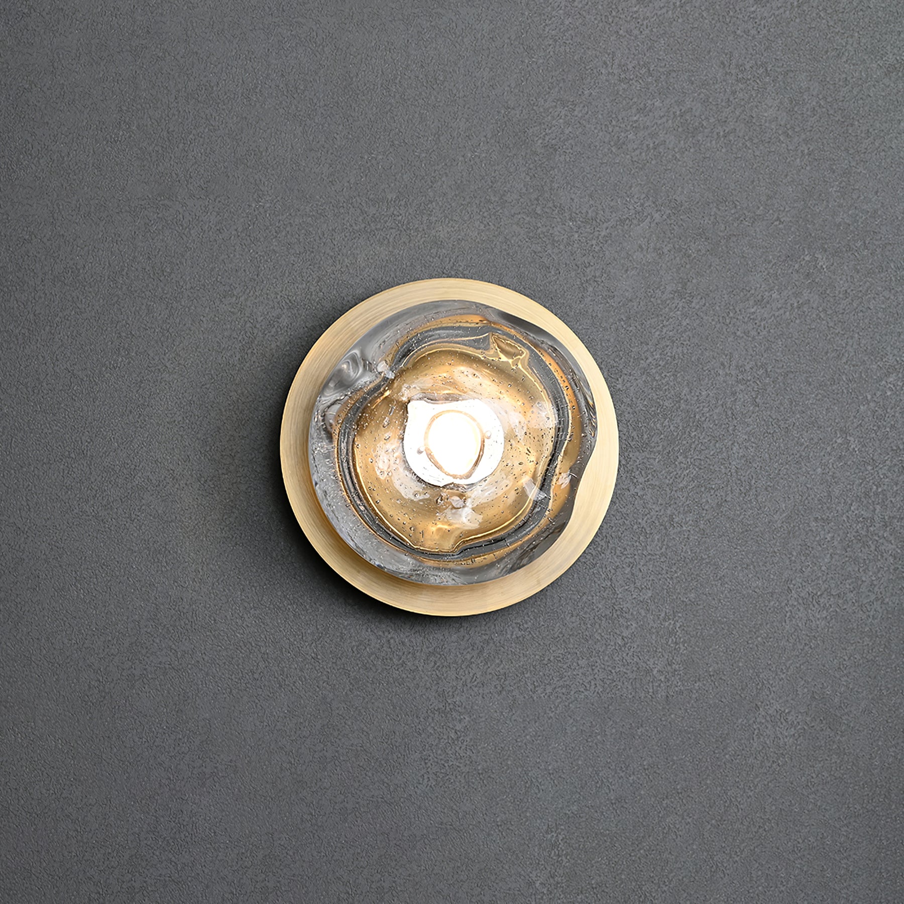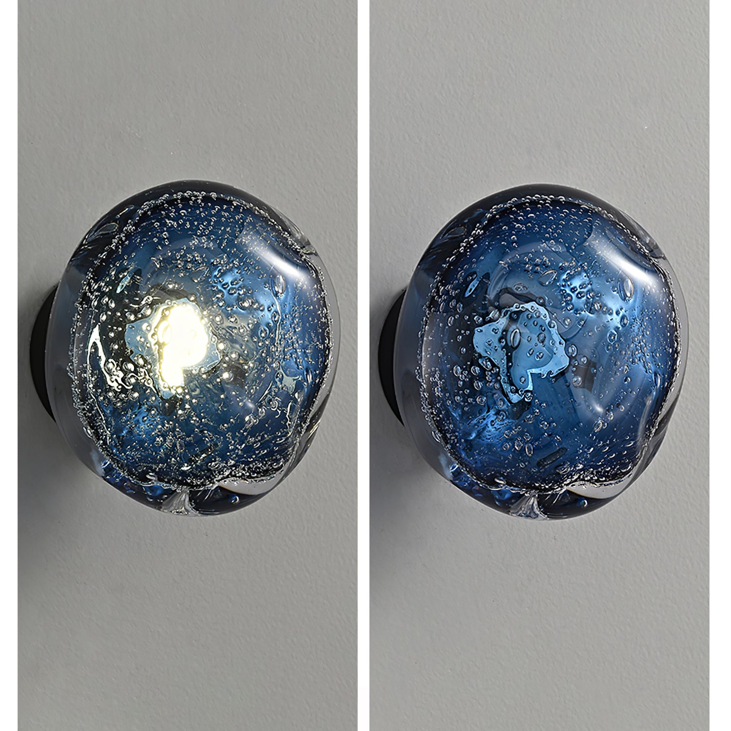The Orrin Molten Glass Wall Light by Vakkerlight captures the beauty of imperfection with its organic, hand-formed glass silhouette. Bubbles and swirls are suspended within the glass, evoking the look of molten rock or frozen liquid light. When lit, it glows like a captured star, adding an ethereal ambiance to any hallway, entryway, or bedroom. Each piece is slightly unique — just like nature intended.