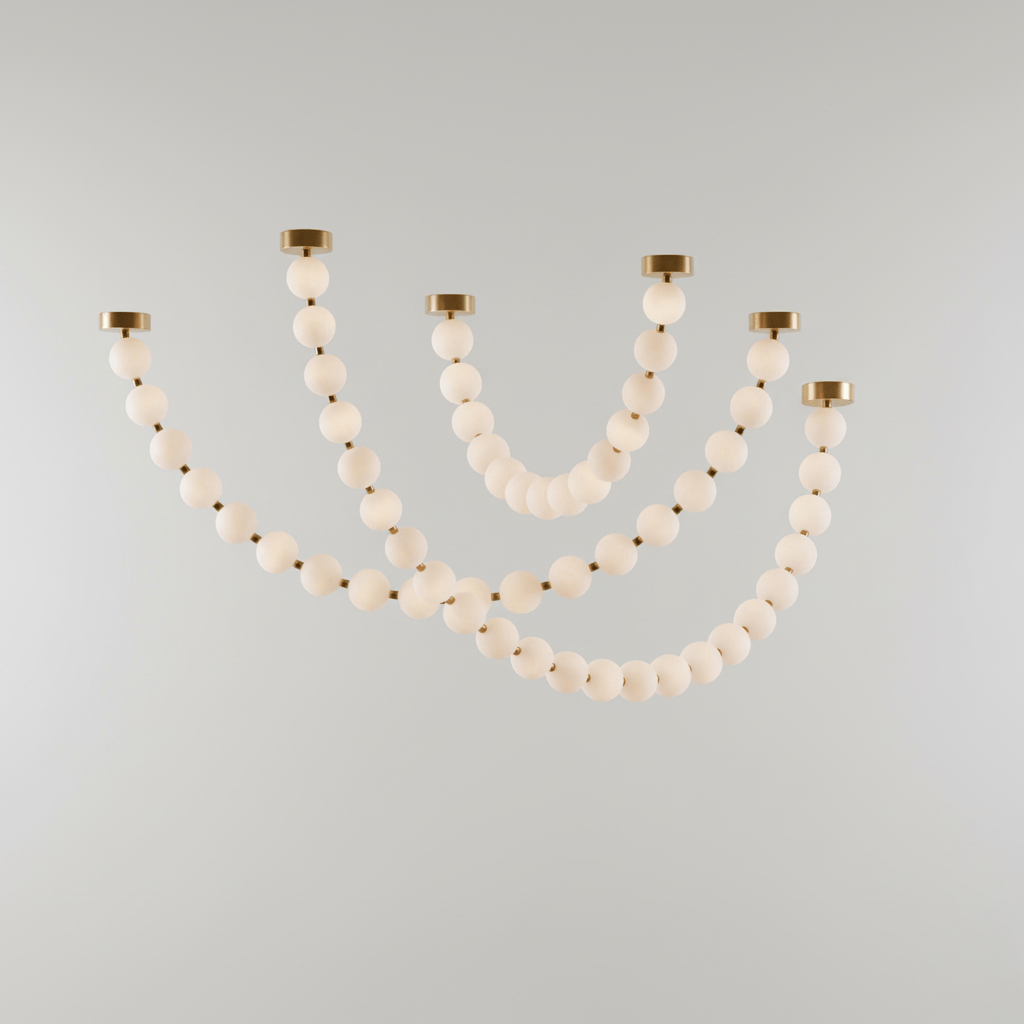 Indulge in the exquisite beauty of our Pearl Necklace Balls Chandelier. Crafted with hand-blown glass and gold joints, this piece exudes luxury. Hidden LED lights offer endless possibilities for hanging and decorating, allowing you to create a truly unique and elegant ambiance. Elevate your space with this sophisticated and exclusive chandelier.