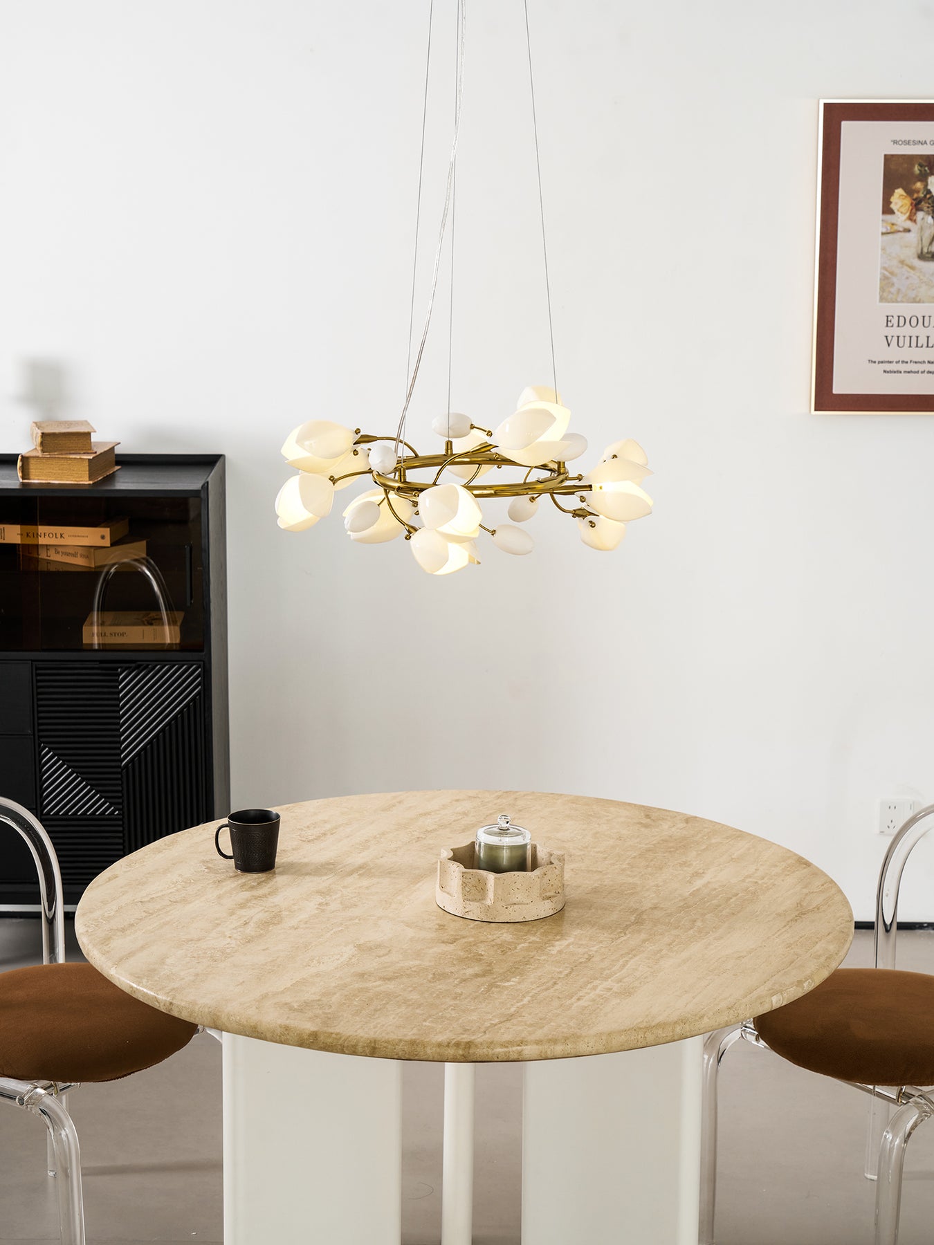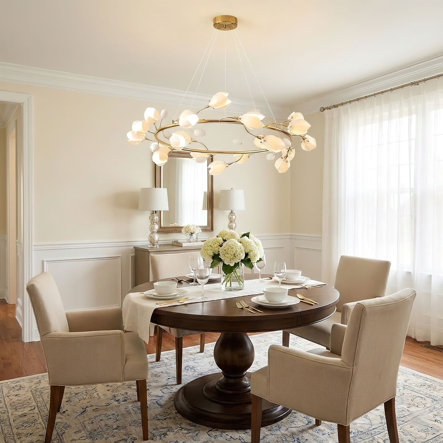 Designed to cast a soft, welcoming light, the chandelier's porcelain flowers gently diffuse the bulbs' glow, creating a harmonious blend of shadow and light that mimics a sun-dappled grove. Ideal for gracing the ceilings of living rooms, dining halls, or atriums, this lighting piece brings the delicate balance and beauty of nature indoors, making it a sophisticated centerpiece for both contemporary and traditional decors.