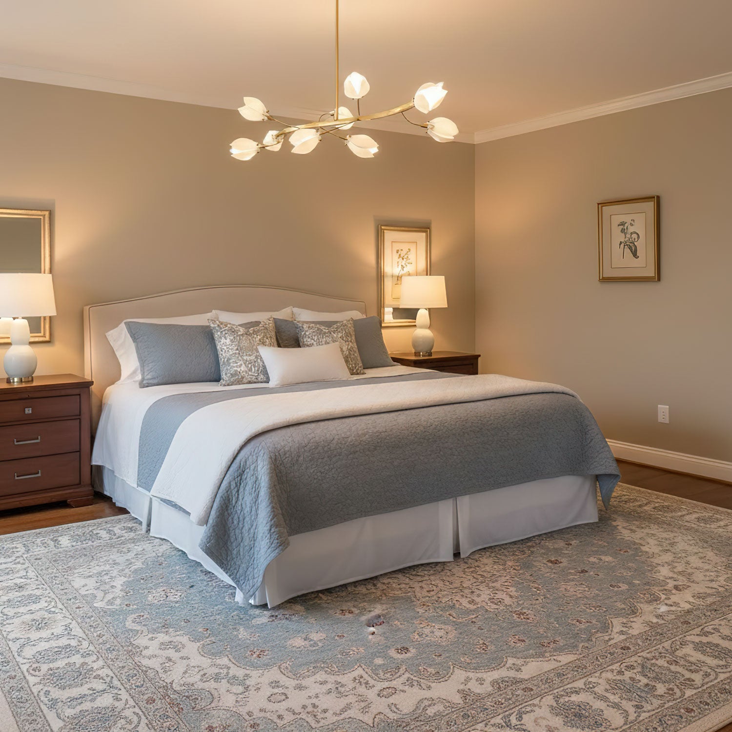 Ceiling Fixtures: Bedrooms benefit from soft, ambient lighting. Use the room dimension formula to ensure the ceiling fixture is properly scaled. Semi-flush or flush mounts work well for general lighting, while sconces or bedside lamps provide focused task lighting.