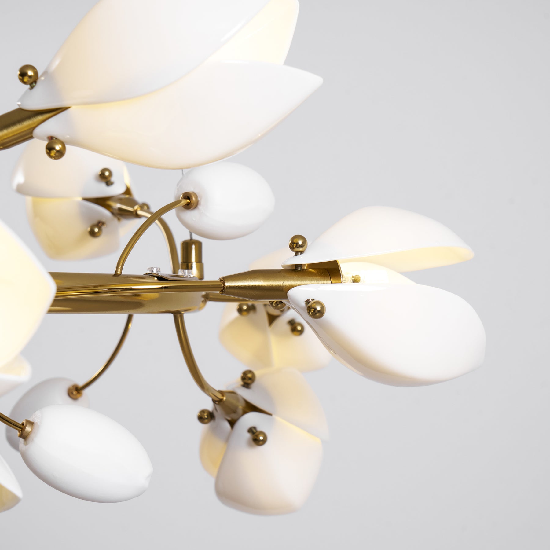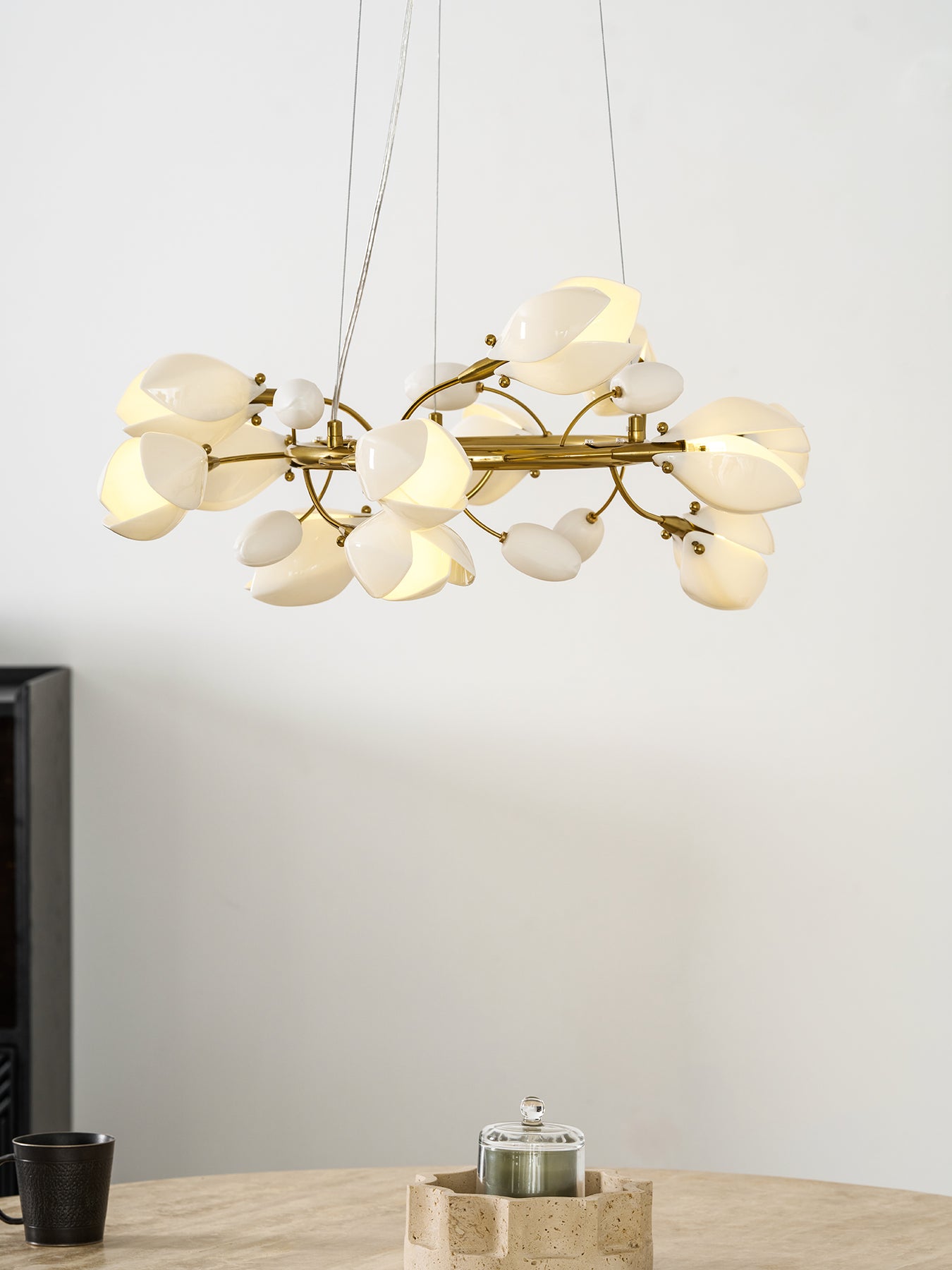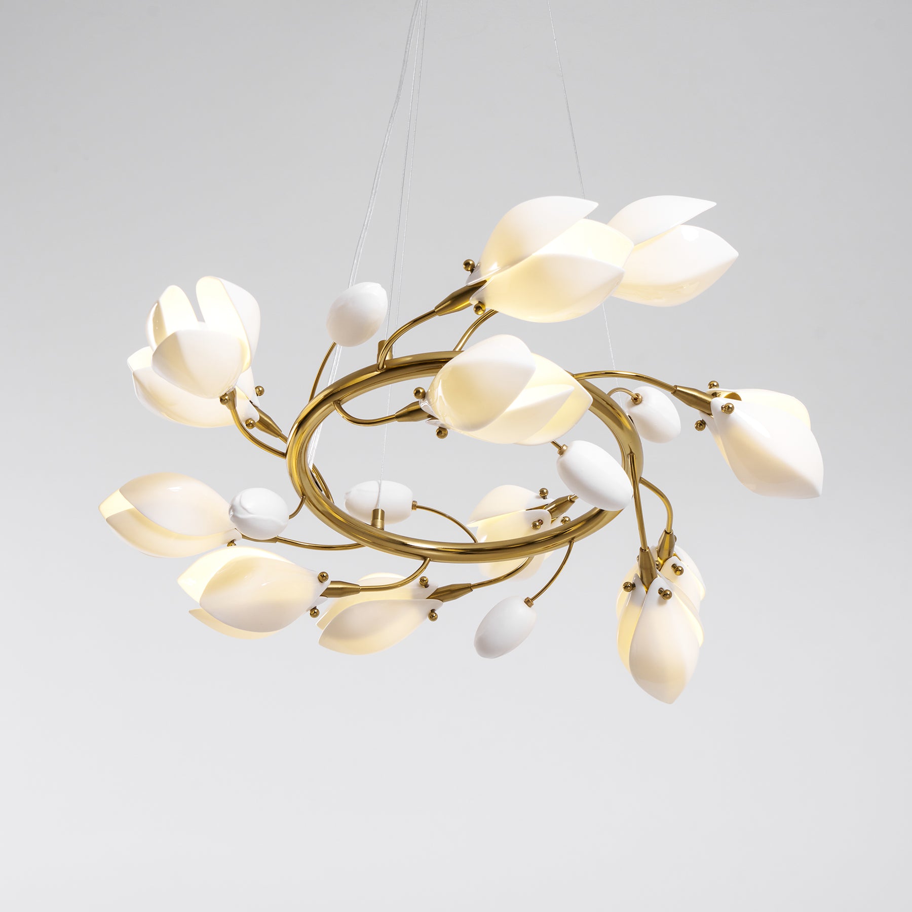 The White Porcelain Magnolia Branch Chandelier gracefully encapsulates the serene beauty of magnolia flowers in full bloom. Each petal is sculpted from pristine white porcelain, exuding an air of purity and tranquility, while the robust metal branches add a contrasting structural elegance. This chandelier doesn't merely illuminate a room; it transforms any space into a haven of peace and refinement.