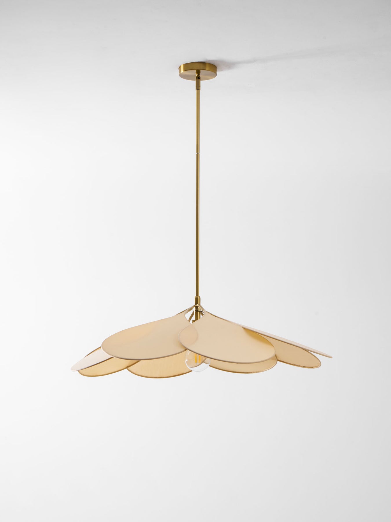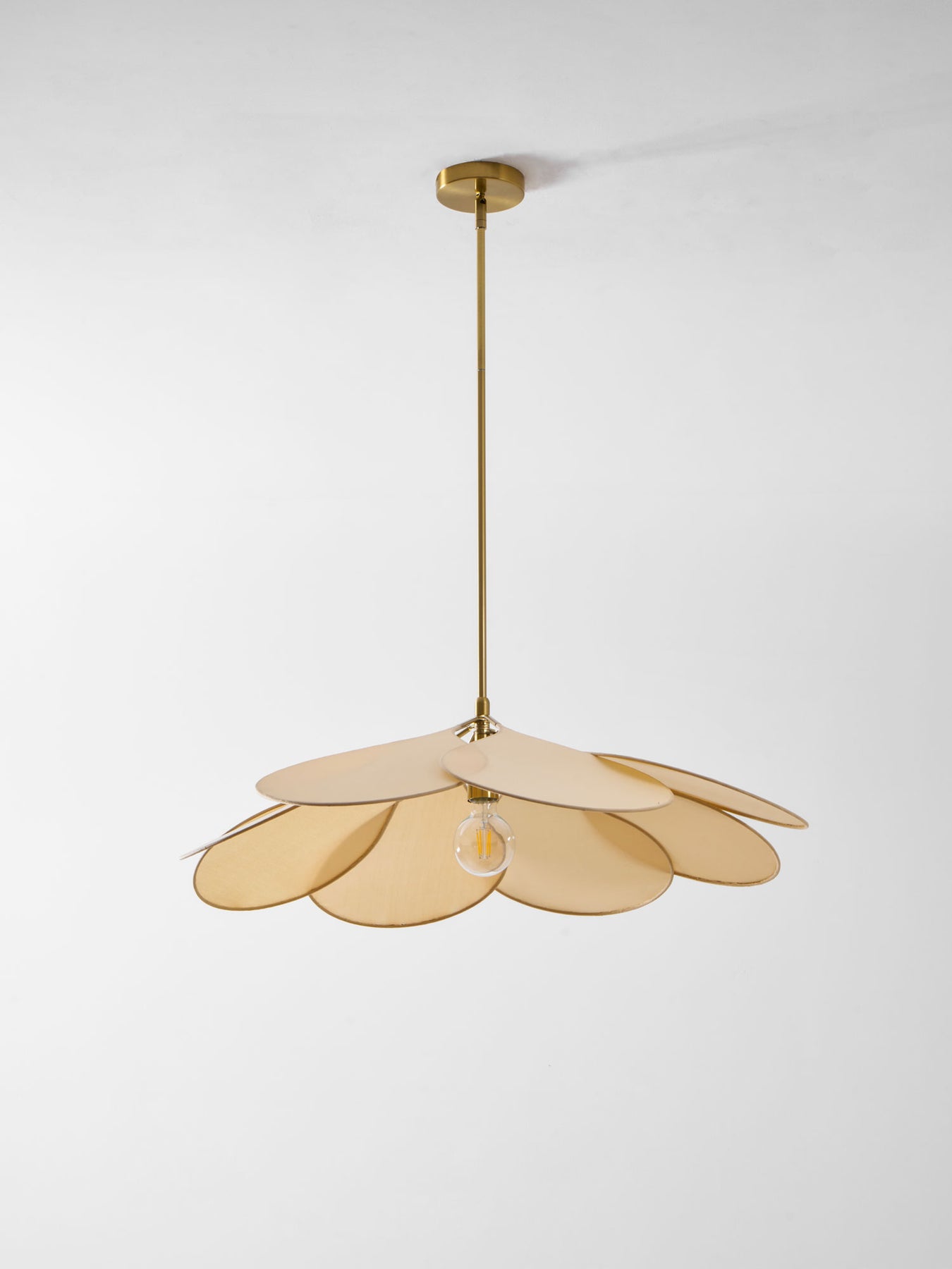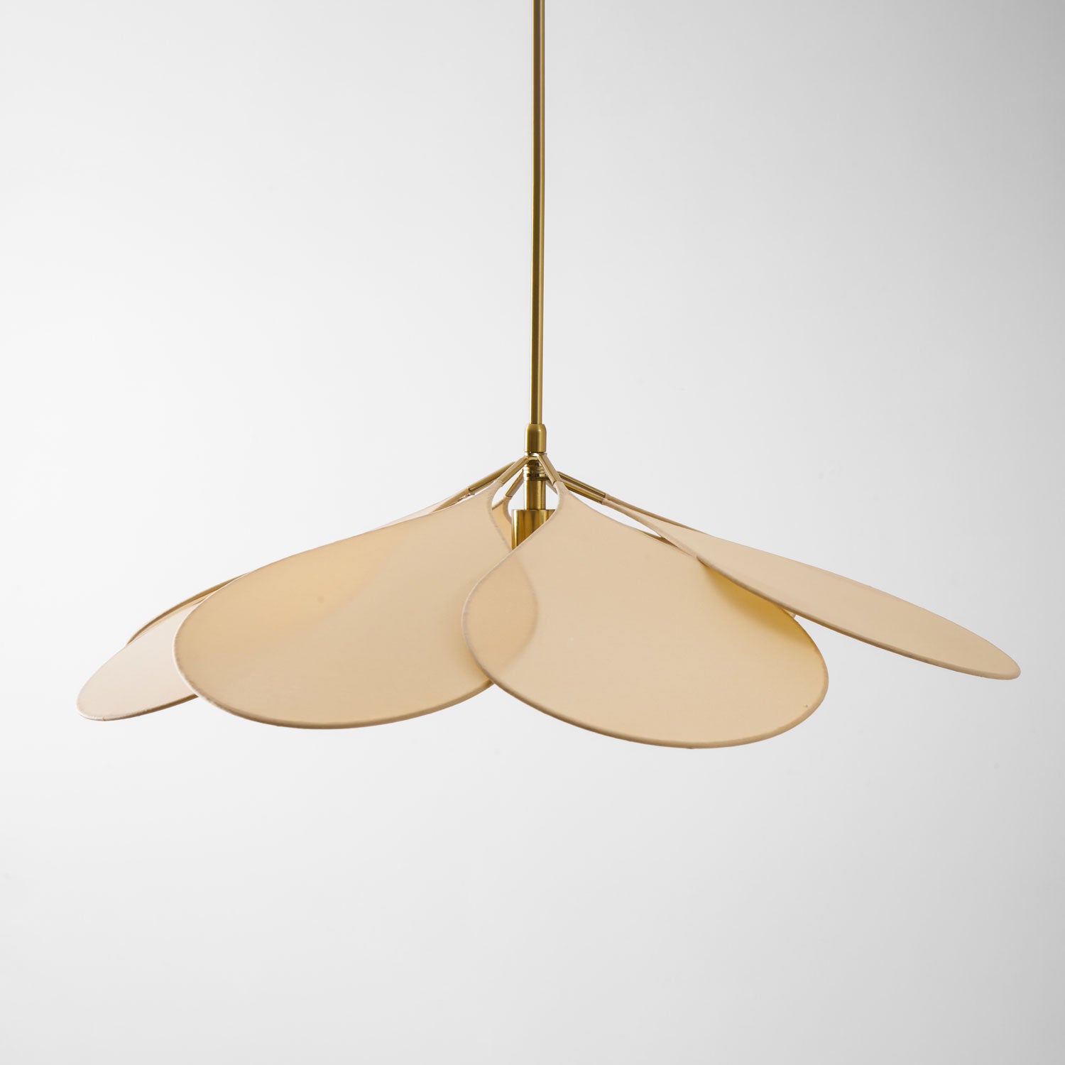 The unexpected combination of metal, and fabric in a floral and airy suspension. To the sleekness of a teardrop-shaped petal, the designer adds an homage to the retro ceiling fans of louvered bedrooms. This petal pendant plays subtly with light, diffusing a soft clarity in the room and delicate shadows on the ceiling.