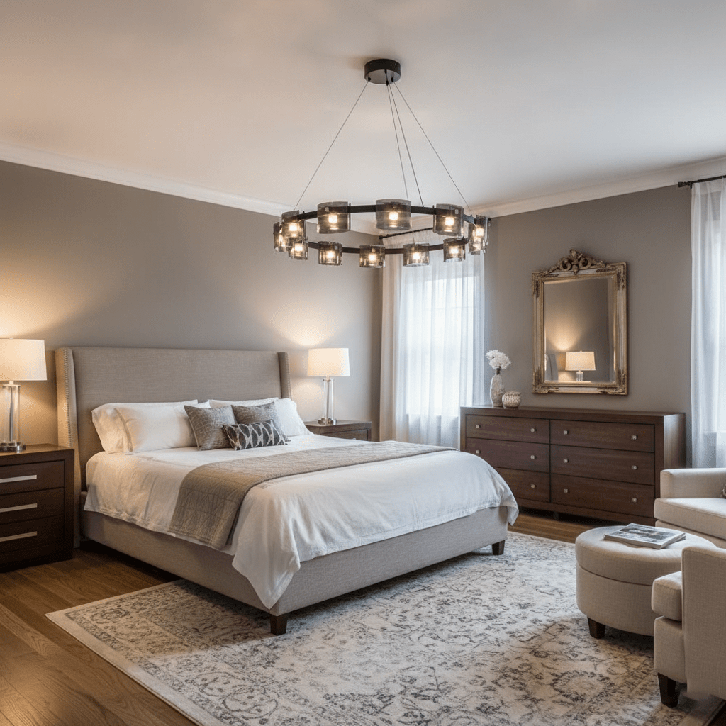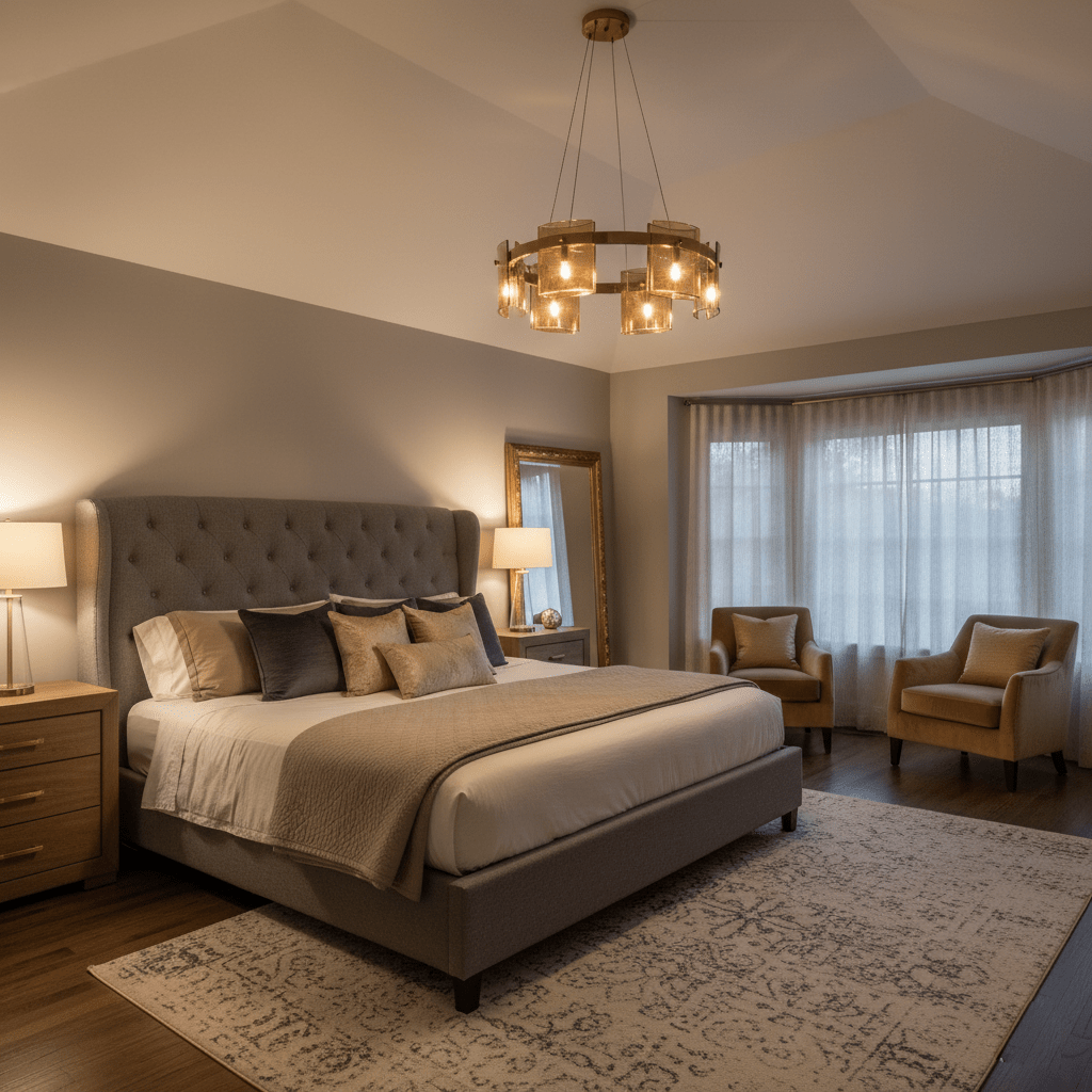 Ceiling Fixtures: Bedrooms benefit from soft, ambient lighting. Use the room dimension formula to ensure the ceiling fixture is properly scaled. Semi-flush or flush mounts work well for general lighting, while sconces or bedside lamps provide focused task lighting.