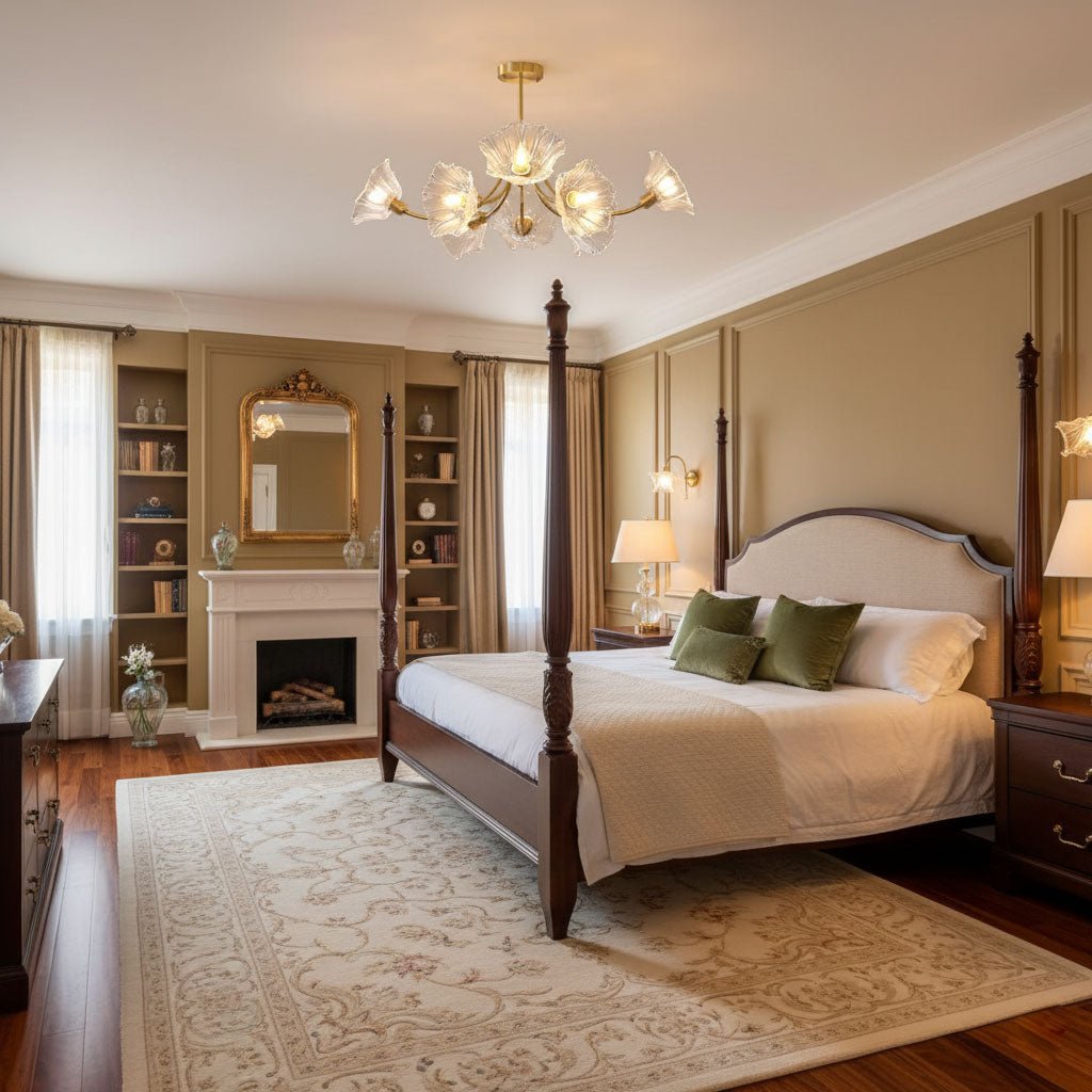 • Ceiling Fixtures: Bedrooms benefit from soft, ambient lighting. Use the room dimension formula to ensure the ceiling fixture is properly scaled. Semi-flush or flush mounts work well for general lighting, while sconces or bedside lamps provide focused task lighting.