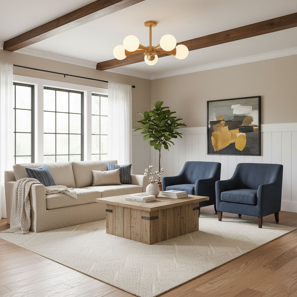 • Chandeliers and Pendants: These are the focal points of the living room, especially in rooms with higher ceilings. To size appropriately, use the room dimension formula and ensure the fixture is in scale with the room’s layout. A general rule is to ensure there is at least 7 feet of clearance between the fixture and the floor.