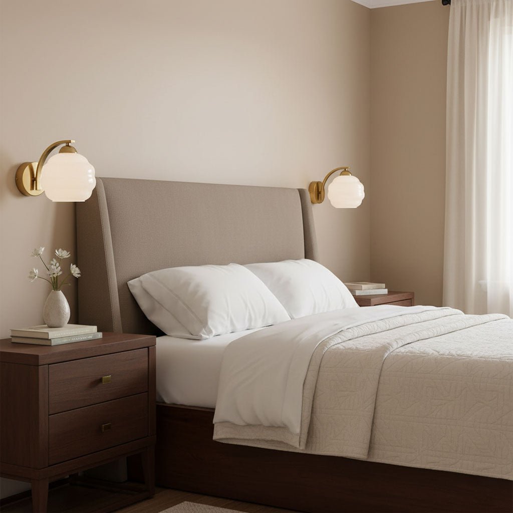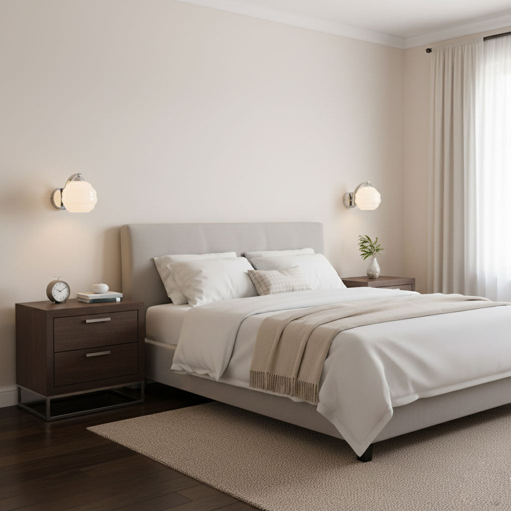 Task Lighting: Bedside lamps or wall sconces should be proportionate to the size of the nightstands and the bed. The lamp height should be roughly at eye level when sitting in bed.