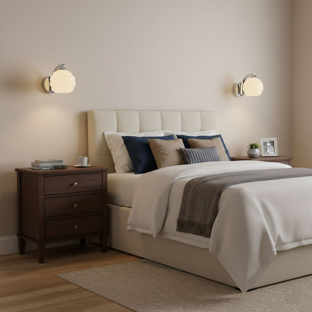 | Bedroom | Length + Width (in feet), converted to inches for fixture diameter. | Flush mounts, semi-flush mounts, bedside lamps, wall sconces, floor lamps. | Bedside lamps should be eye-level when seated. Use flush or semi-flush mounts for ambient lighting, and add sconces for task lighting. |