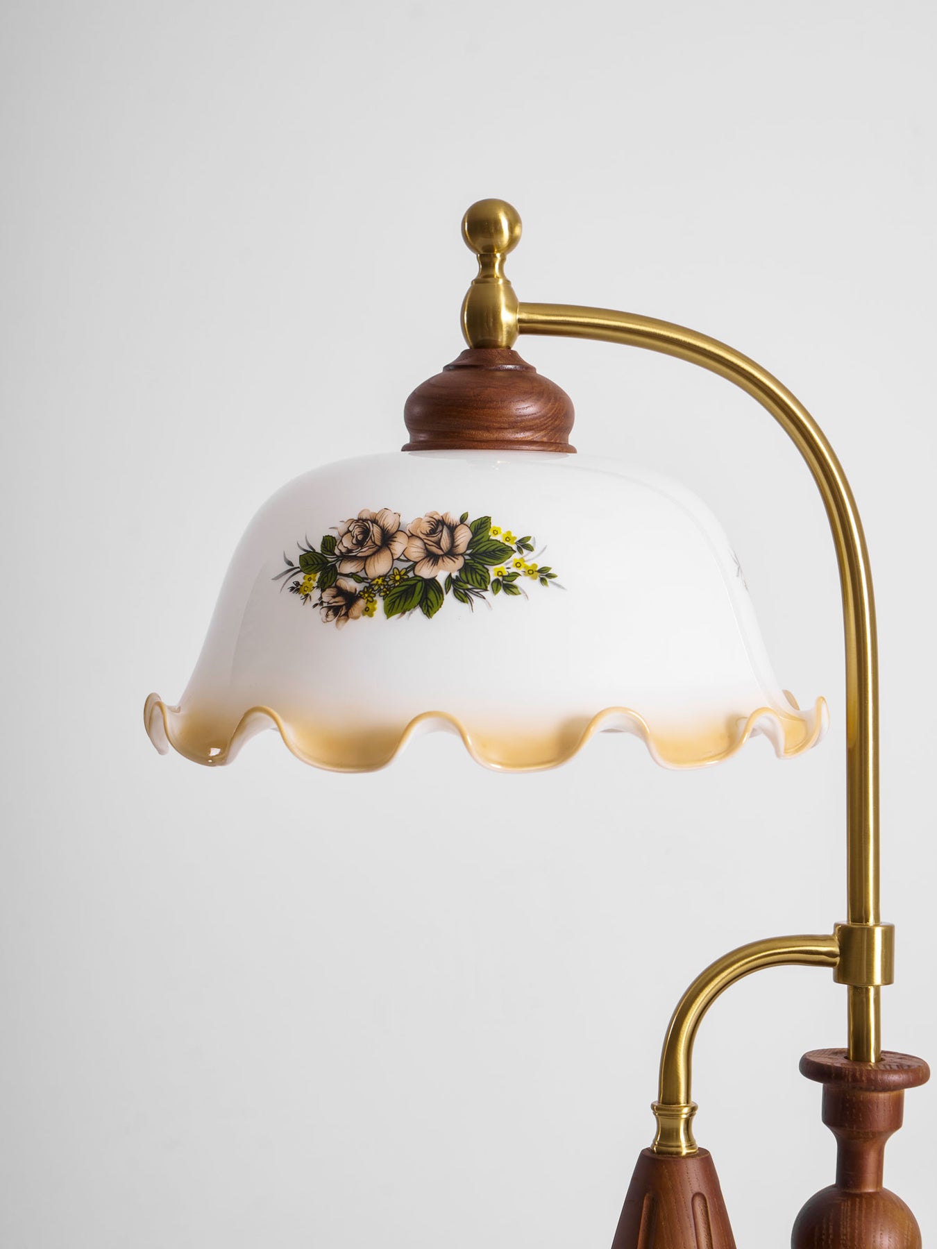 Illuminate your space with sophistication and elegance using our Heritage Bloom Table Lamp. Crafted with graceful iron arms, delicate frosted glass shade, and hand-painted floral details, this lamp exudes vintage charm. The fan-shaped edge and wooden base add a touch of luxury, perfect for creating a warm and nostalgic ambiance in your bedroom, living room, or study.