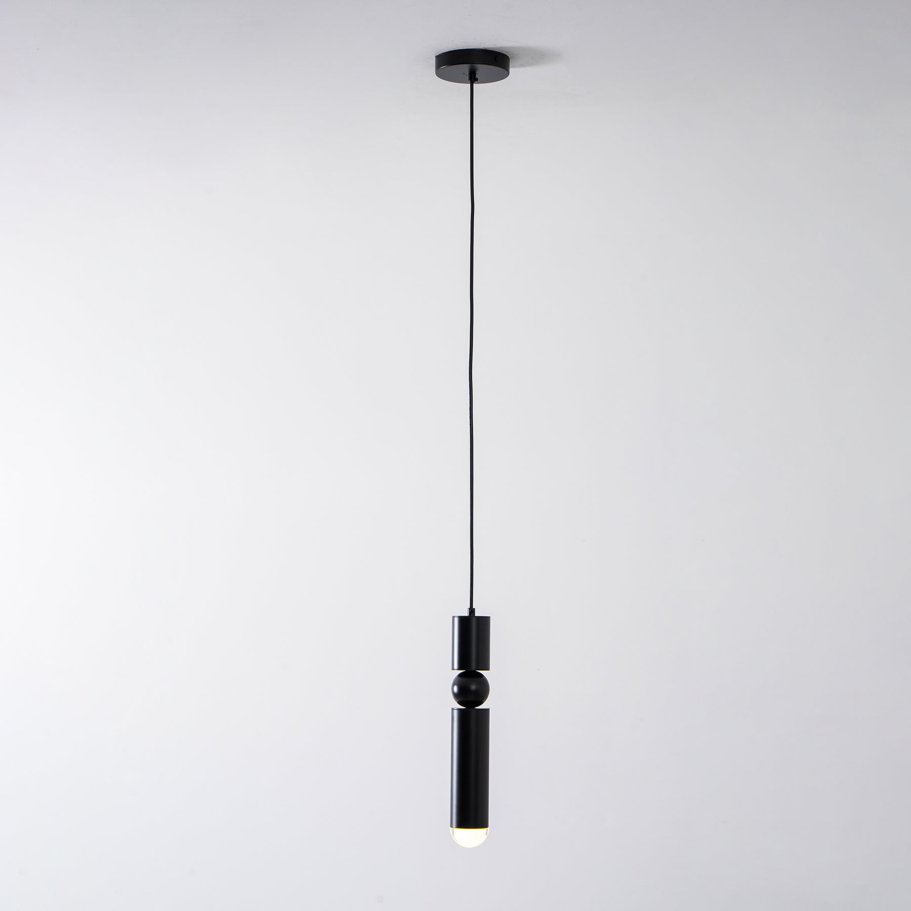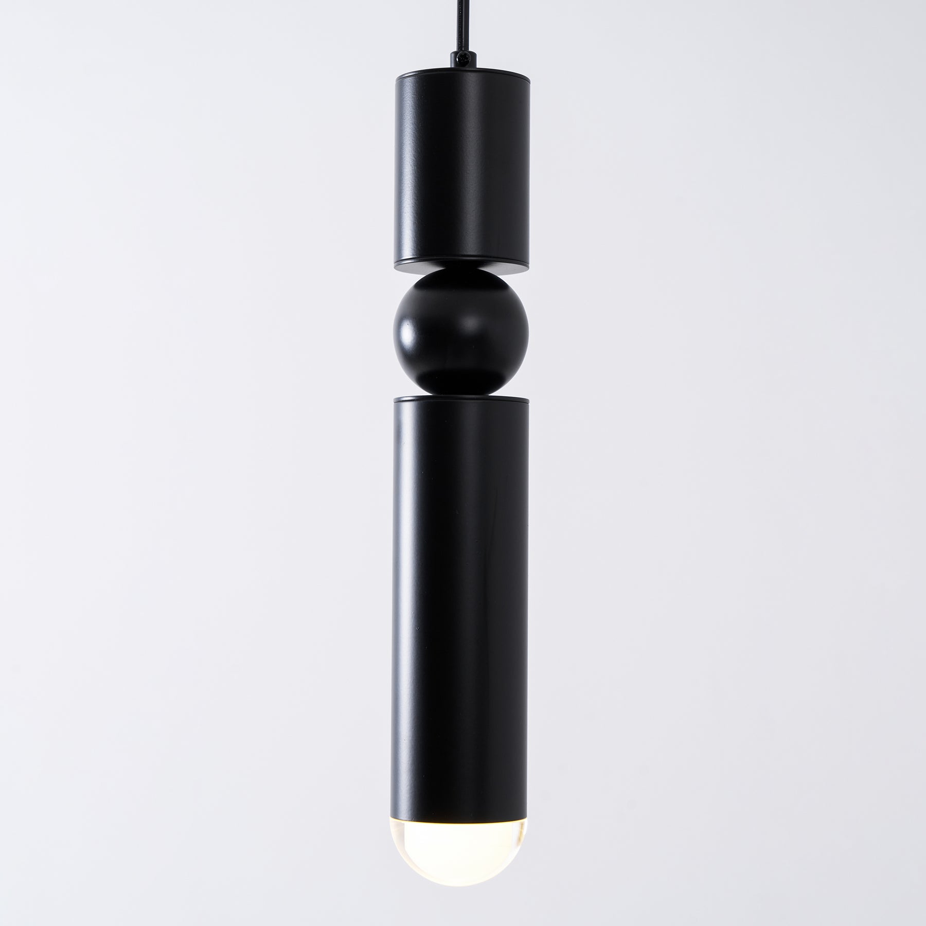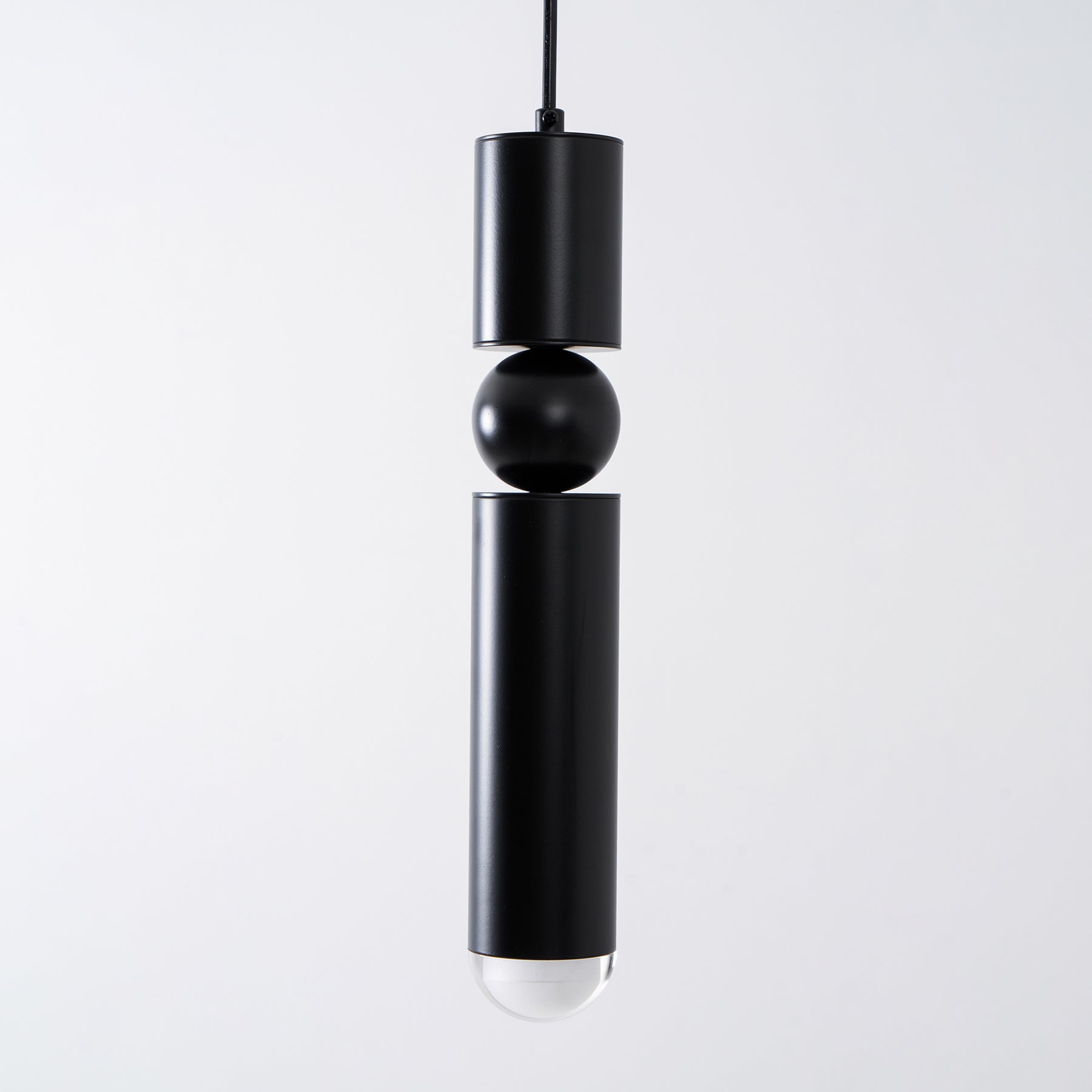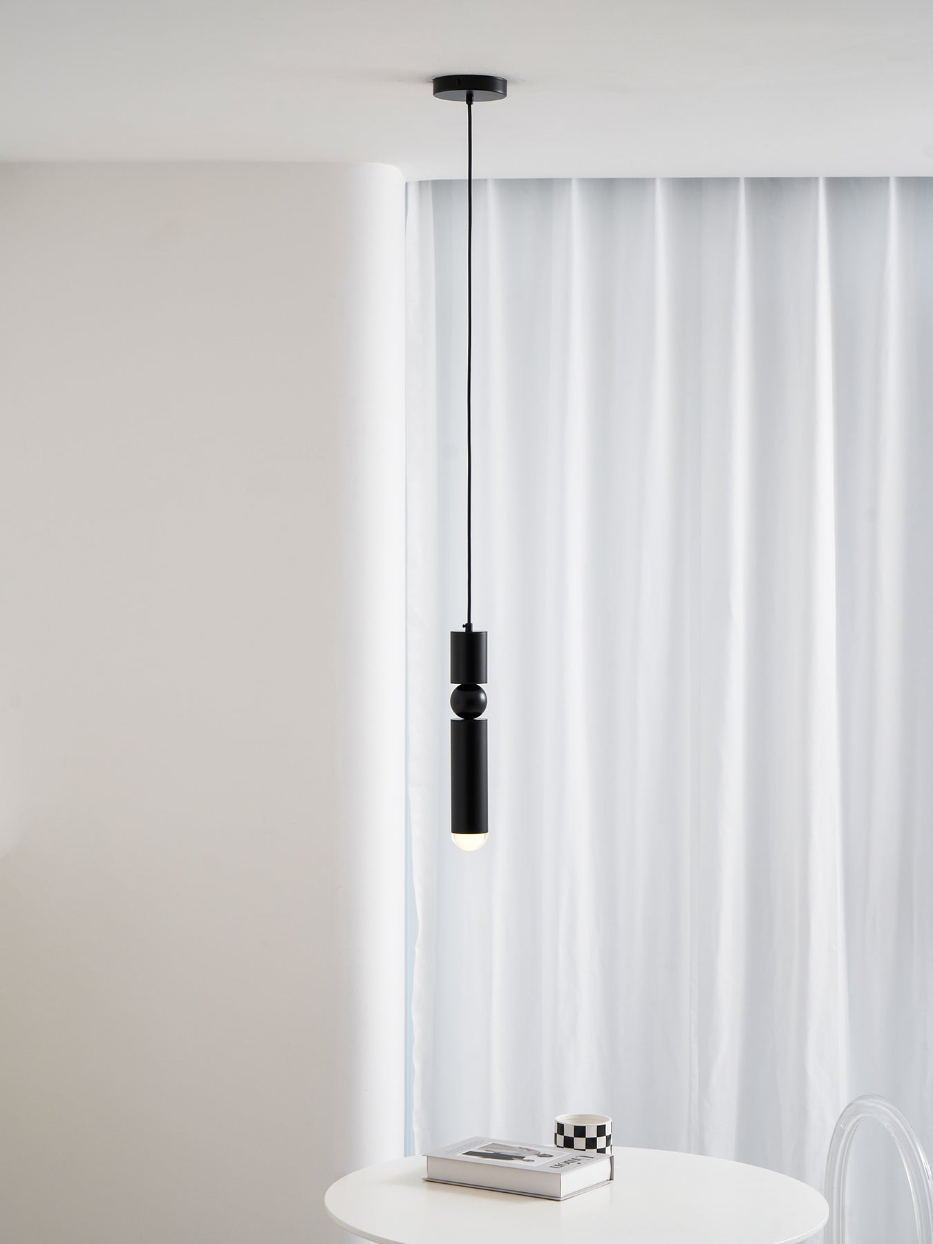 Continuing the exploration of pivots and supports, Fulcrum Light is a slimline pendant of gold, chrome or black cylinders suspended around a central sphere.