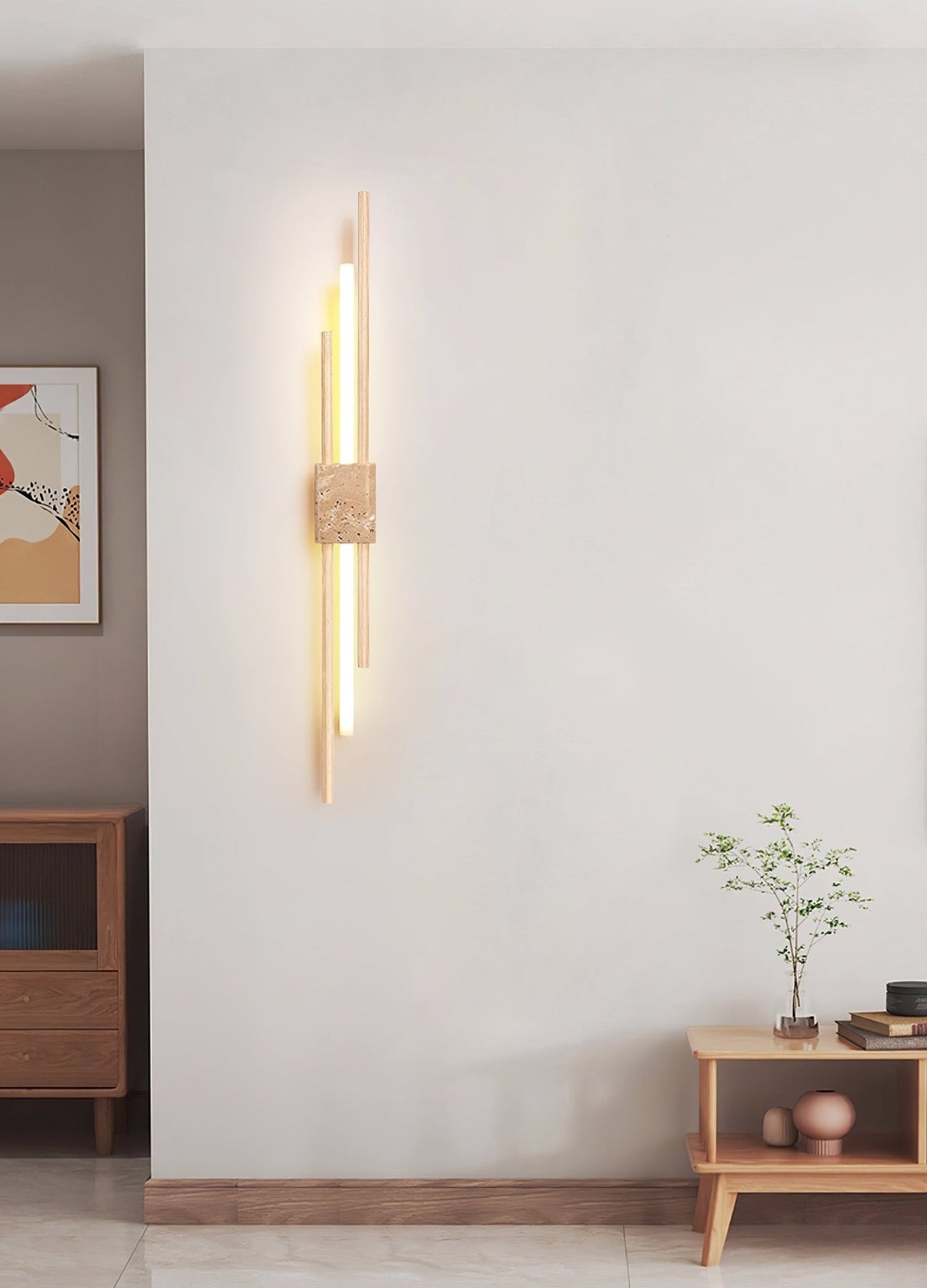 The Axis Terra Wall Light by Vakkerlight is a sophisticated union of geometric balance and natural materials. Featuring two slender wood rods suspended vertically through a central cube of textured travertine, this design exudes minimalism with a sculptural edge. The warm integrated LED glow extends from both ends, casting a soft vertical illumination ideal for modern hallways, living spaces, or entryways. The raw beauty of stone contrasts elegantly with the sleek metallic lines, creating a timeless piece that blends art, architecture, and ambient light.