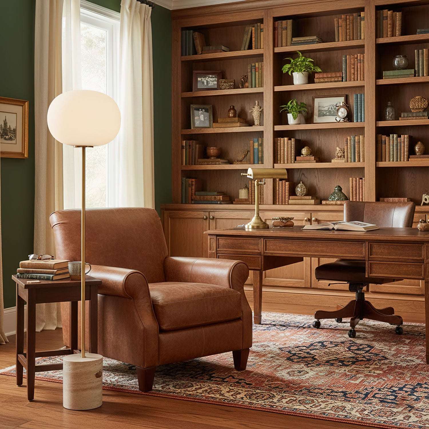 The Elaris Floor Lamp blends contemporary artistry with refined materials, creating a captivating centerpiece for any space. Its solid, veined marble base grounds the design with natural sophistication, while a sleek, brushed gold shaft rises gracefully, drawing the eye upward. Atop this elegant structure rests a frosted glass globe, casting a warm, ambient light that transforms your room with a serene, radiant atmosphere.