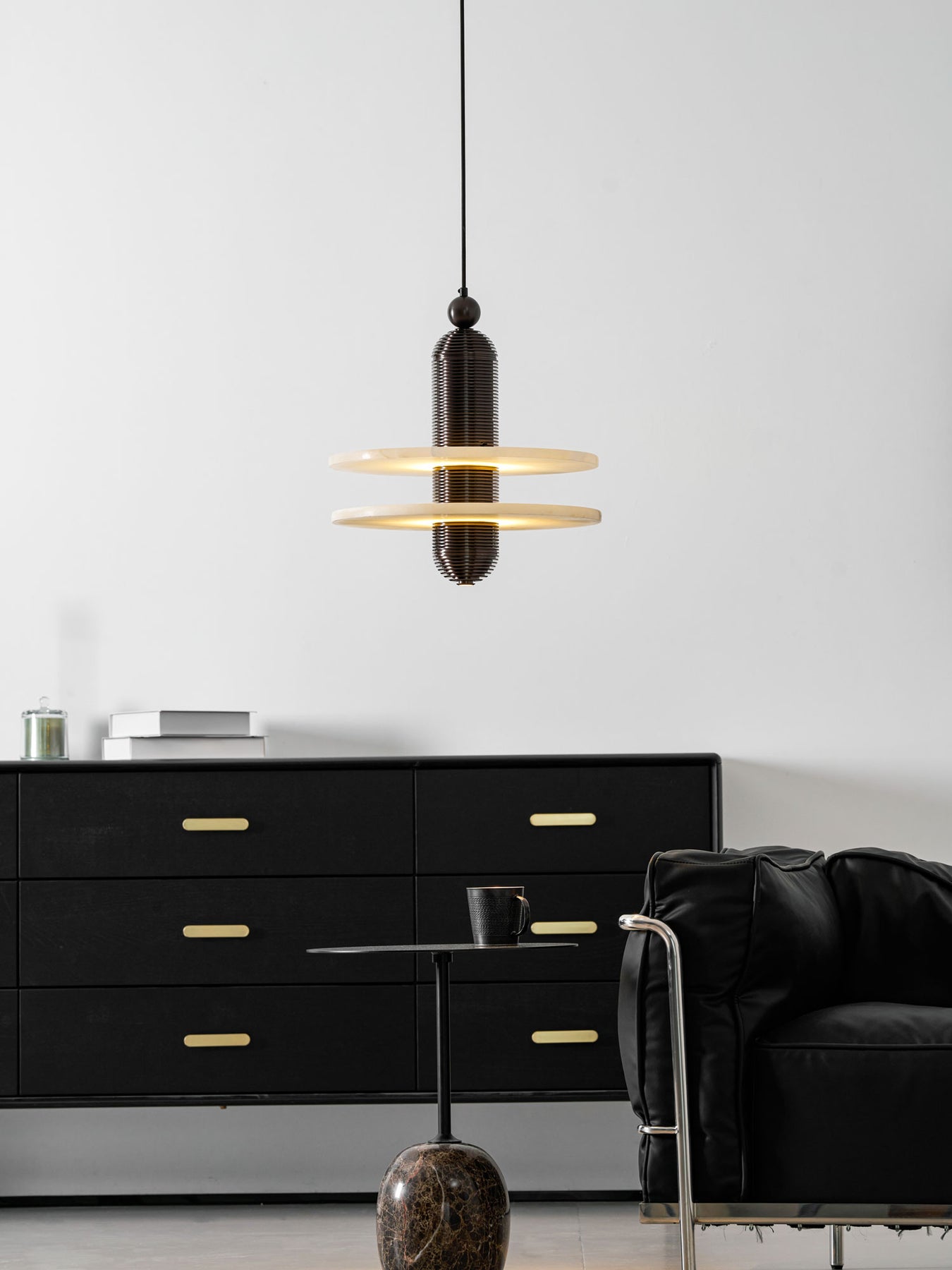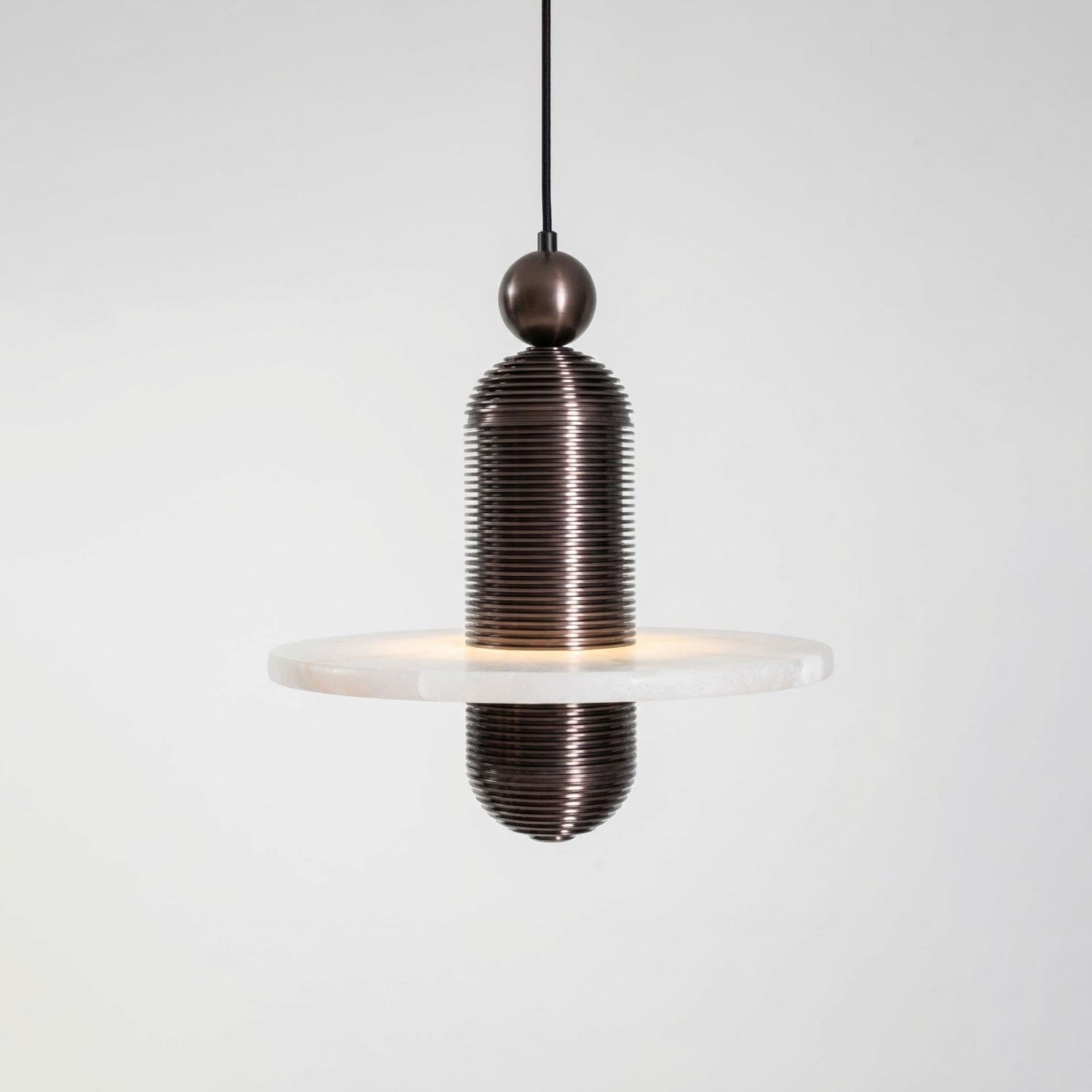 Inspired by the majestic form of Saturn, this pendant light features a circular alabaster diffuser paired with ribbed, brass-finished metal elements. The natural translucency of the alabaster emits a warm, ambient glow, while the sculptural design adds a contemporary and luxurious touch to any interior space. Each piece is unique due to the natural variations in the stone, making it a true statement fixture.