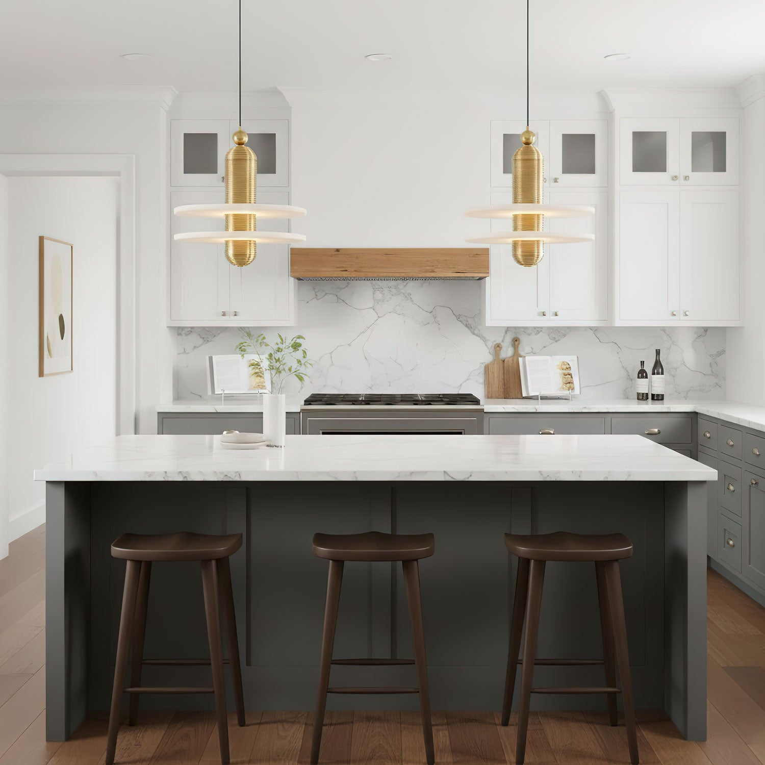 Pendants Over Island: These provide crucial task lighting for food prep and should hang 32-36 inches above the surface. Make sure that each pendant is about 1/4 the length of the island to provide sufficient coverage without overwhelming the space.