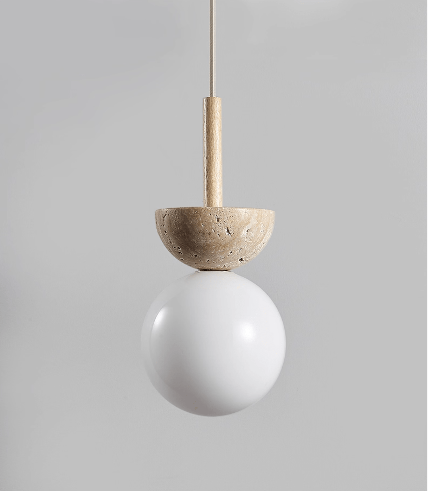 This pendant light features a half-bowl-shaped shade crafted from travertine, showcasing the stone’s natural texture and warm, earthy tones. The travertine bowl rests gracefully atop a glowing globe-shaped bulb, suspended by a cord. Emitting a soft, ambient glow, it blends the raw, organic charm of travertine with the gentle luminosity of the globe, adding a refined, artistic touch to dining areas, kitchen islands, or living spaces. A perfect balance of natural stone beauty and modern minimalist design.