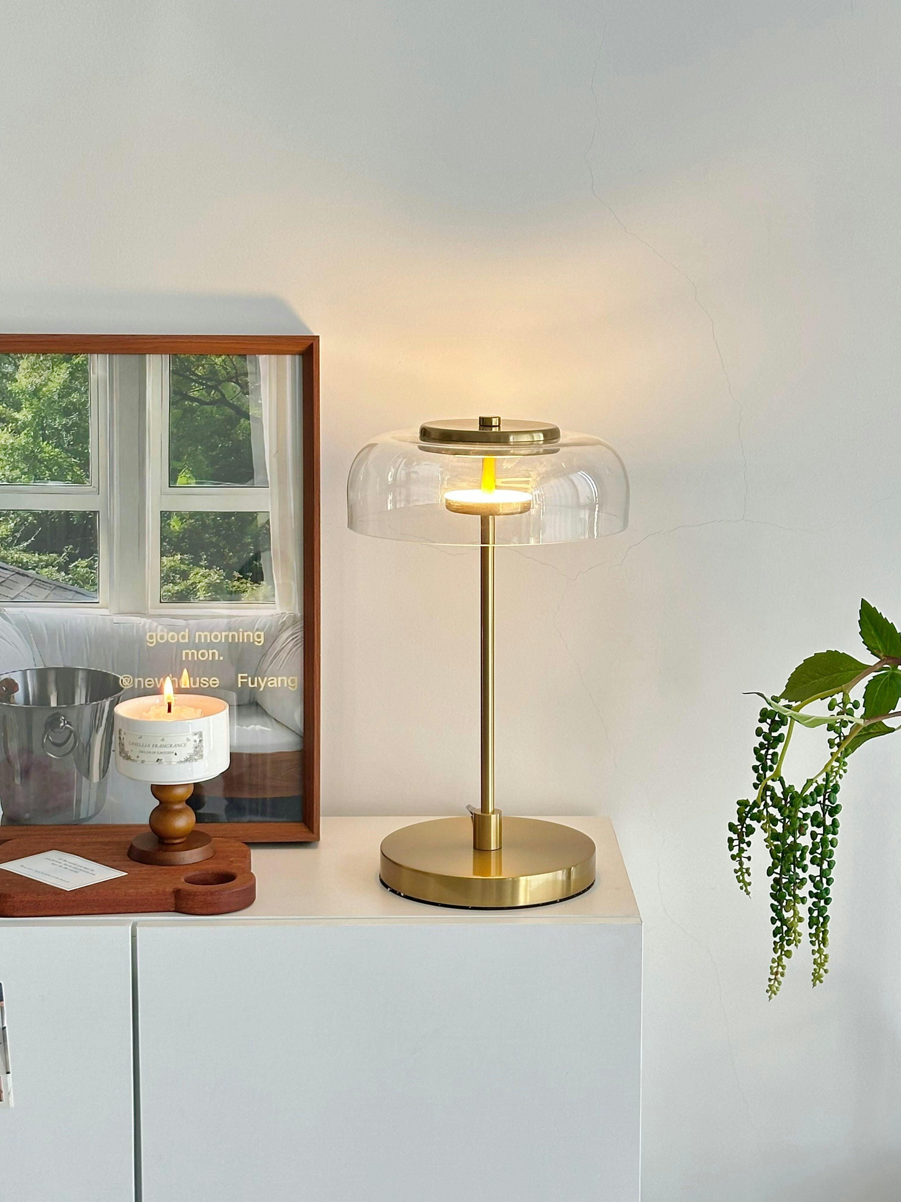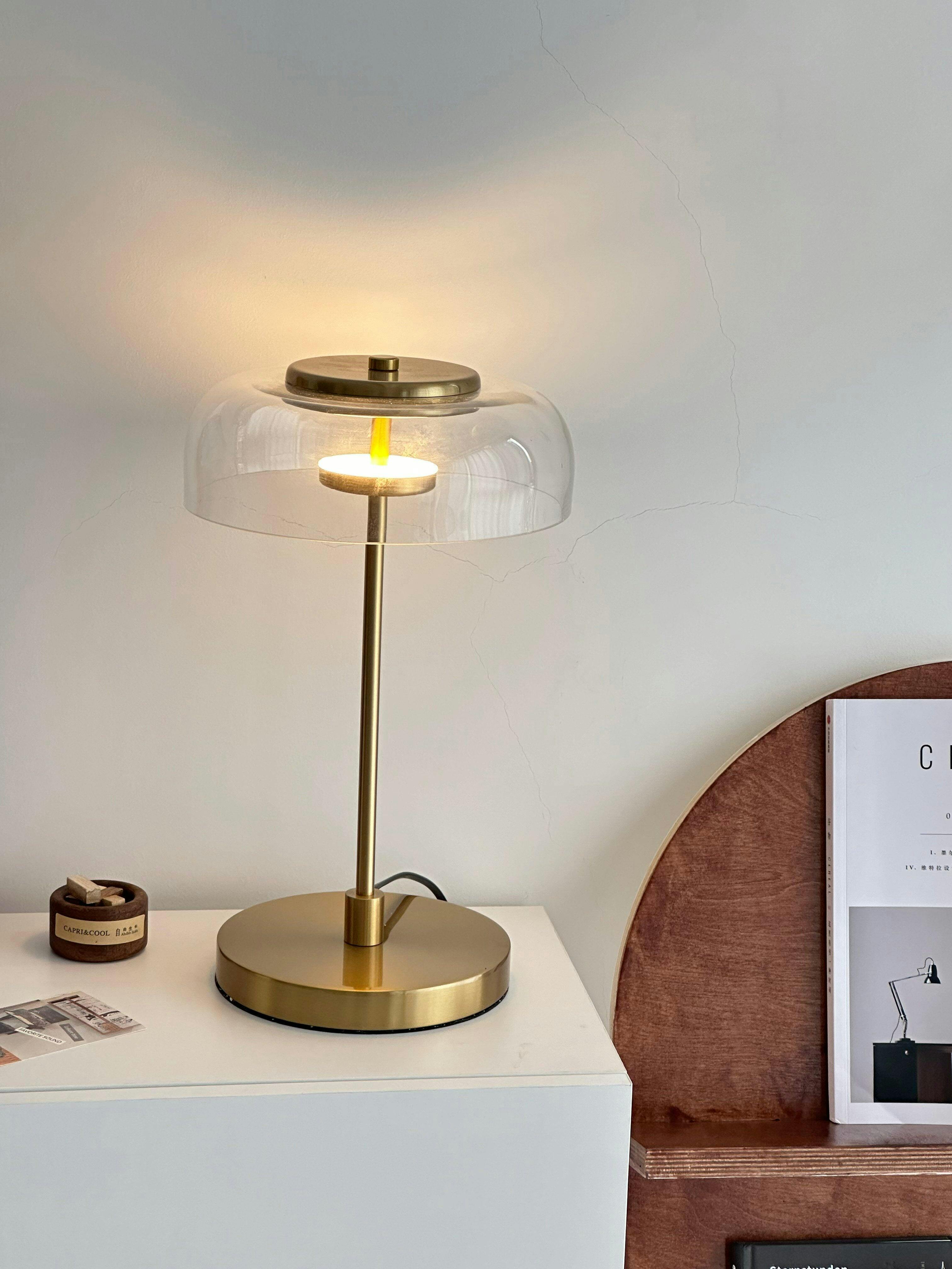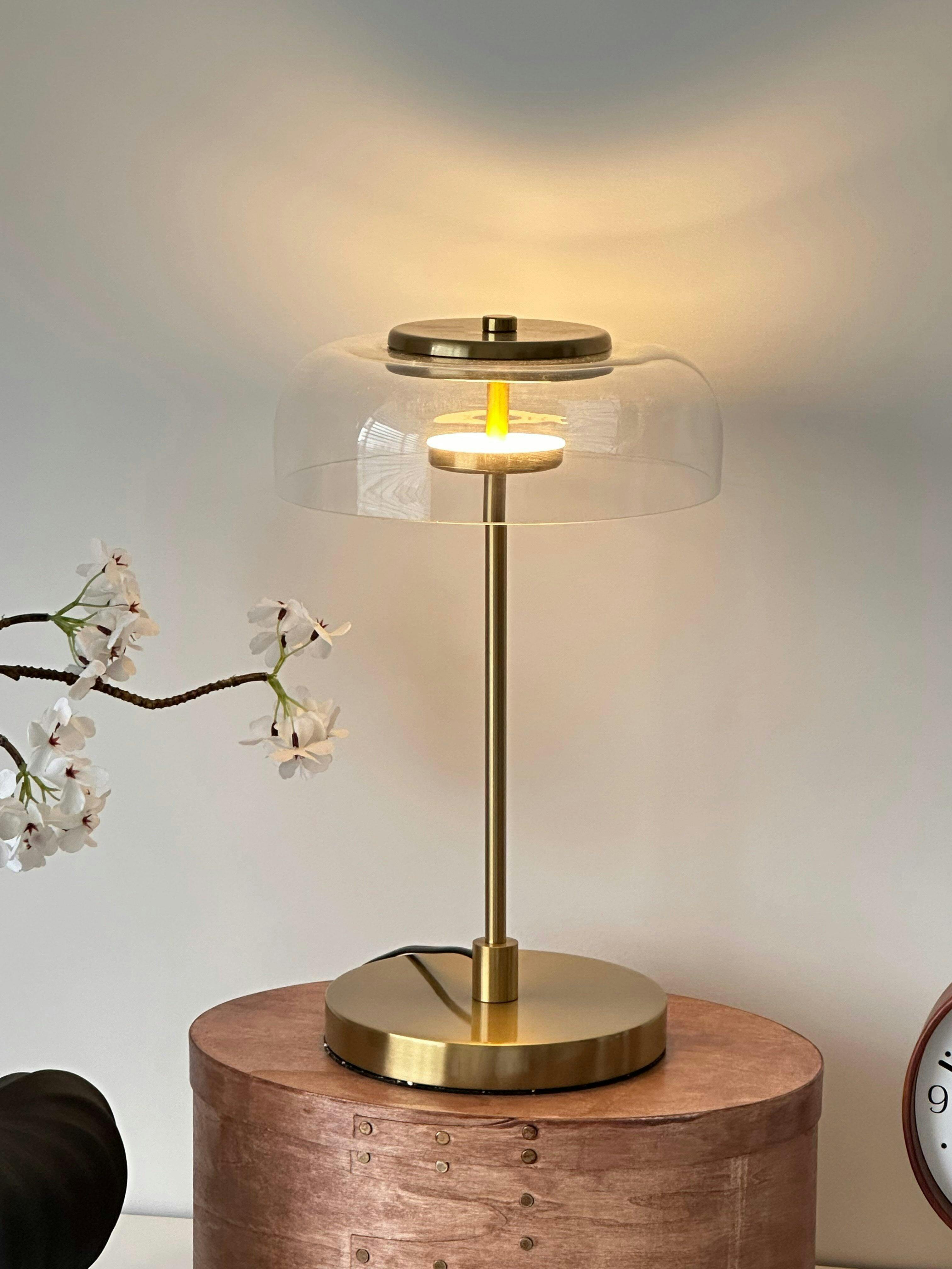 Illuminate your space with the Solara Table Lamp. The warm and soft light reflects onto the gold metal plate, creating a cozy atmosphere. The transparent glass shade adds a touch of elegance to your room. Transform your living space into a warm and inviting environment with this pendant lamp.