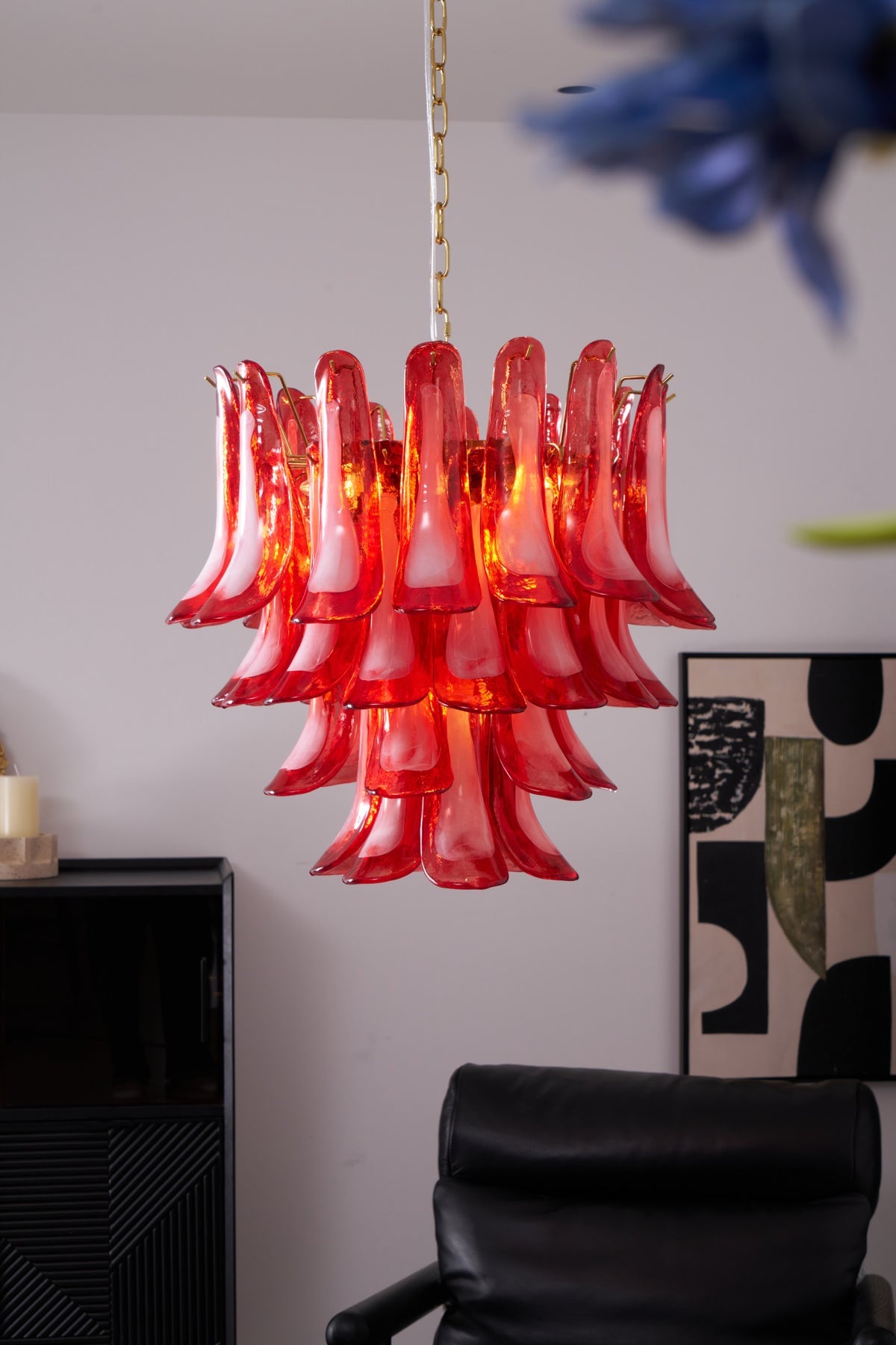 Bold and radiant, the Fiametta Murano Glass Chandelier by Vakkerlight is a tribute to Italian glass artistry. Each hand-formed red glass element curves like a flame, layered in dynamic tiers to create a sense of upward movement and luminous intensity. The deep crimson tones are enriched by a translucent finish that catches and reflects light, creating a warm, passionate glow. Whether suspended above a dining table or gracing a dramatic foyer, Fiametta adds sculptural elegance and an irresistible spark of energy.