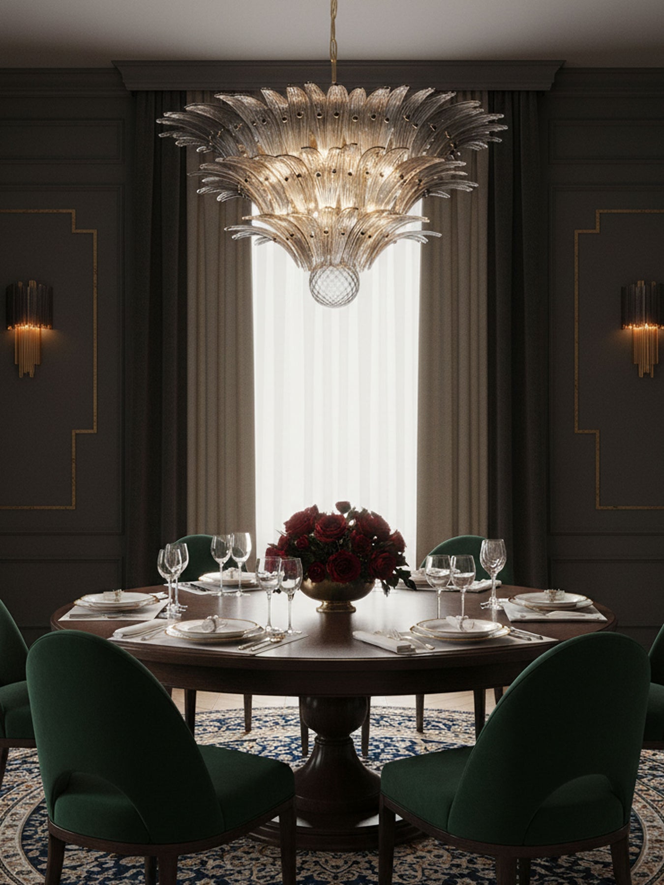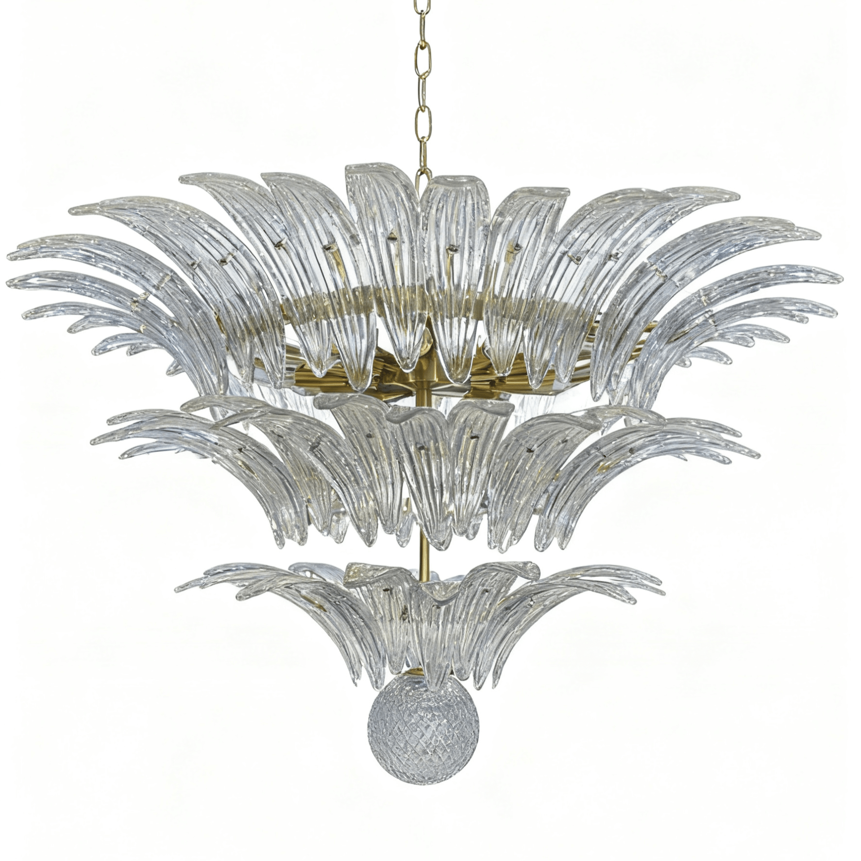 Inspired by the lush elegance of palm leaves, the Palm Grove Murano Chandelier is a masterpiece of craftsmanship and luxury. Featuring hand-blown Murano glass petals arranged in cascading tiers, this statement piece radiates sophistication while casting a warm, ambient glow. Its exquisite detailing and timeless design make it a perfect centerpiece for grand living spaces, upscale dining rooms, and luxury interiors, blending nature's beauty with artisanal excellence.