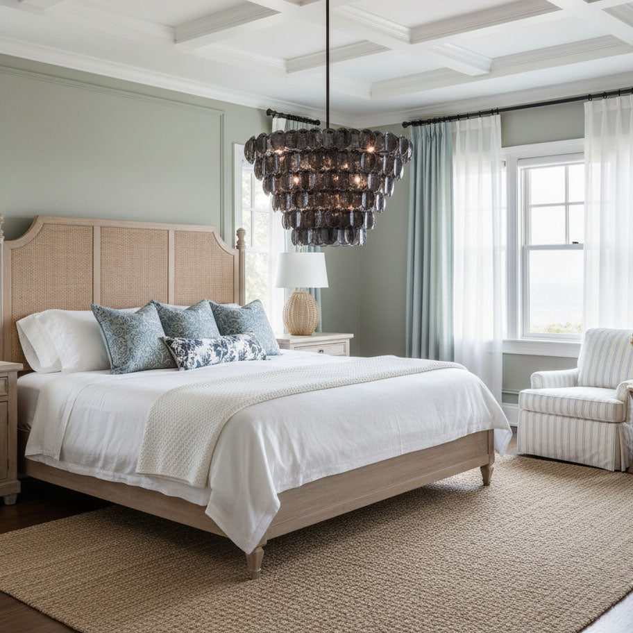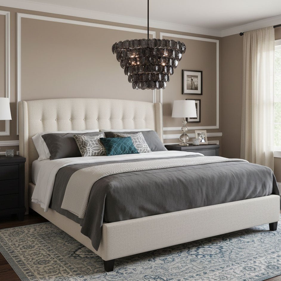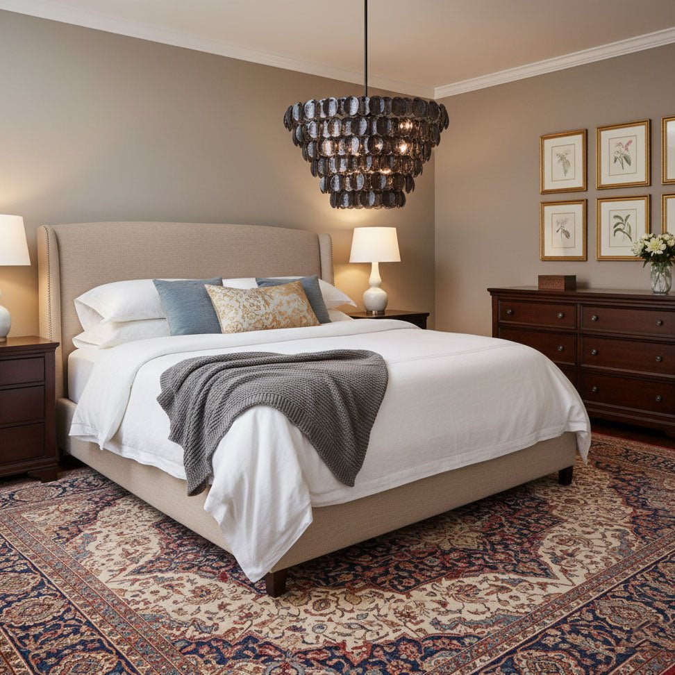 Ceiling Fixtures: Bedrooms benefit from soft, ambient lighting. Use the room dimension formula to ensure the ceiling fixture is properly scaled. Semi-flush or flush mounts work well for general lighting, while sconces or bedside lamps provide focused task lighting.