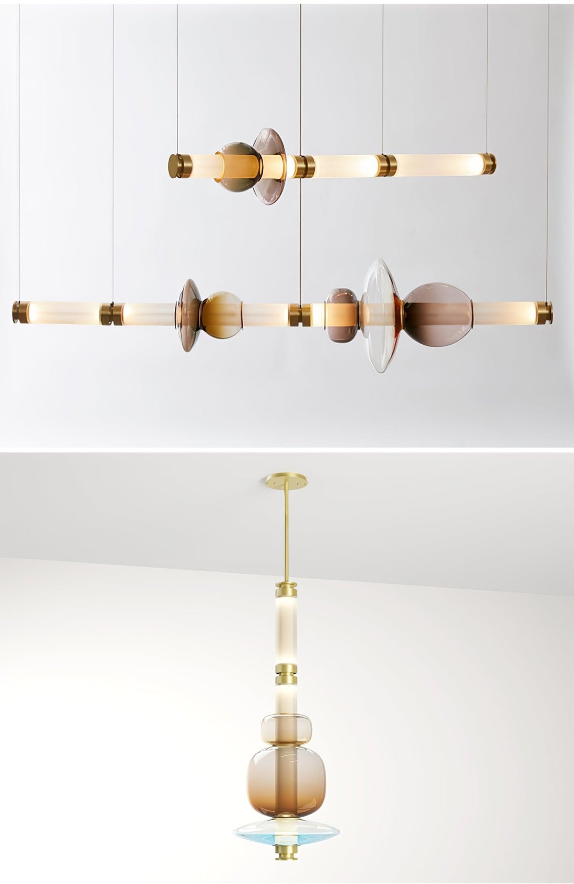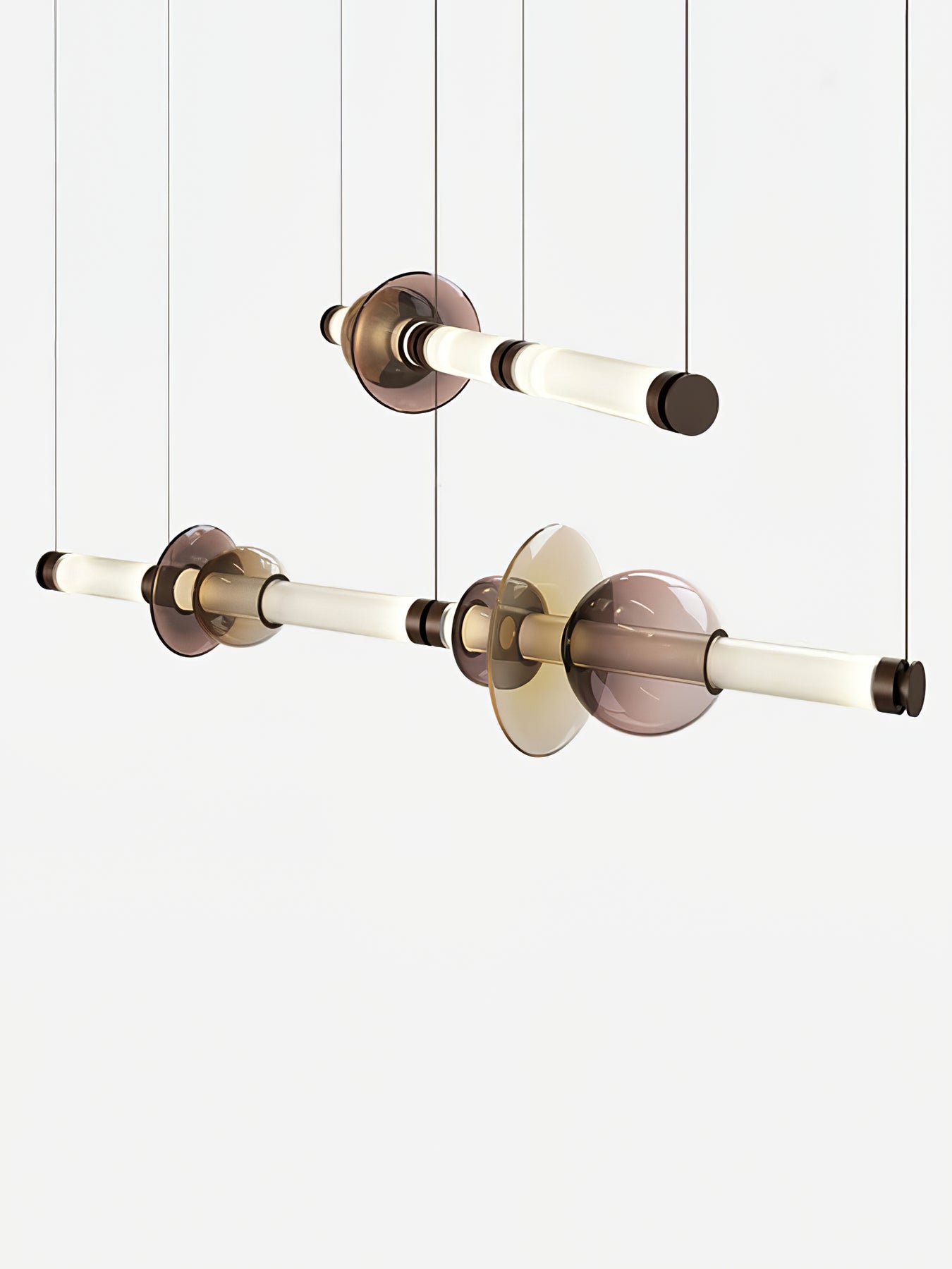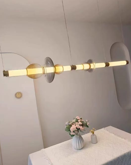 The Vakkerlight Glass Bead Linear Pendant Light showcases a linear design adorned with glass beads and discs in diverse tones. Suspended by delicate wires, the interplay of translucent glass and metallic accents crafts an elegant and artistic aesthetic. When illuminated, it emits a soft, ambient glow, merging modern style with a touch of delicate charm, making it a standout piece for dining rooms or living spaces.