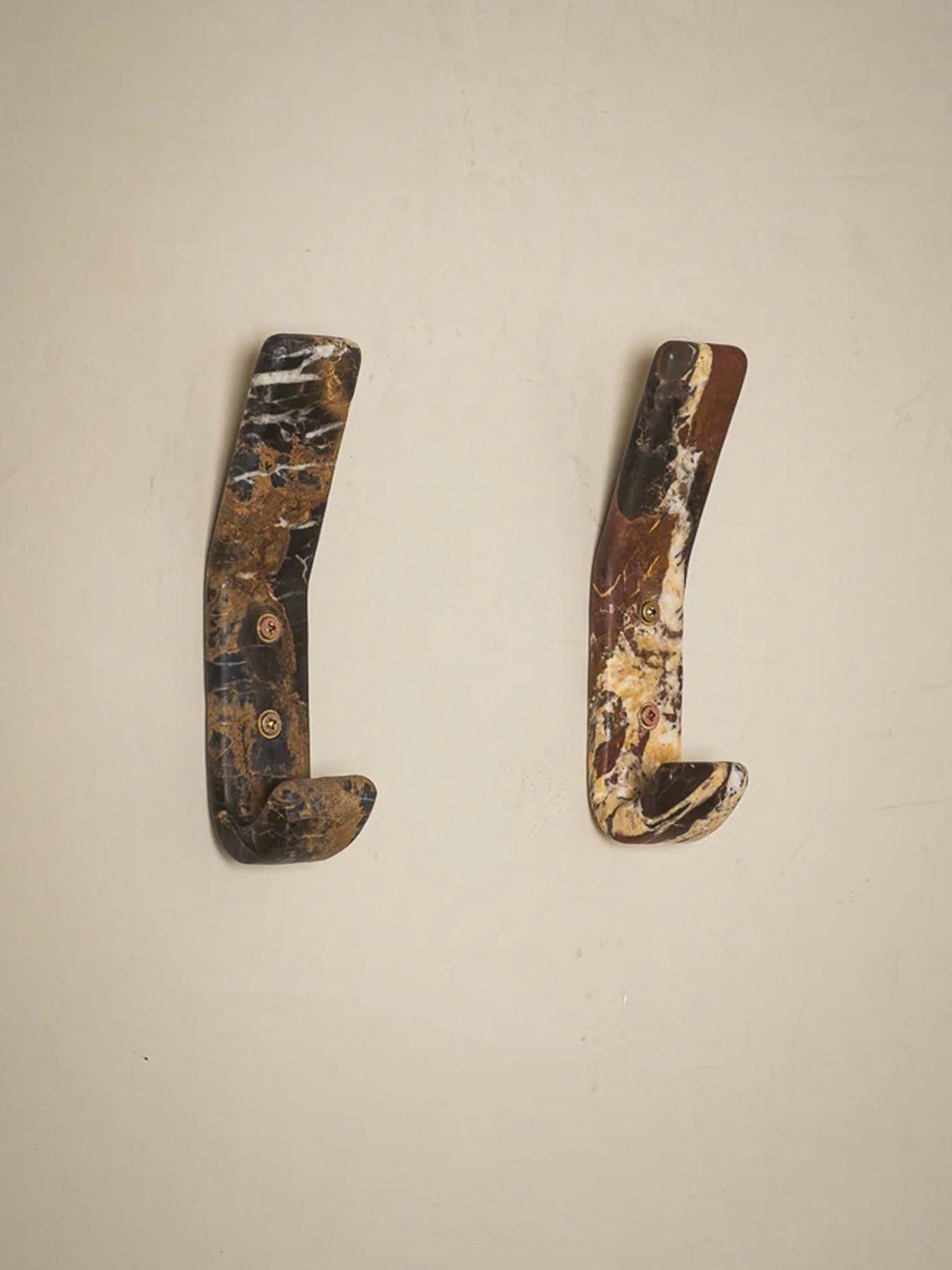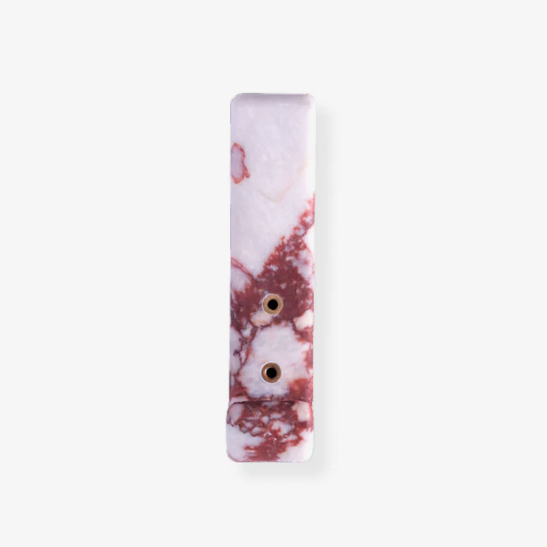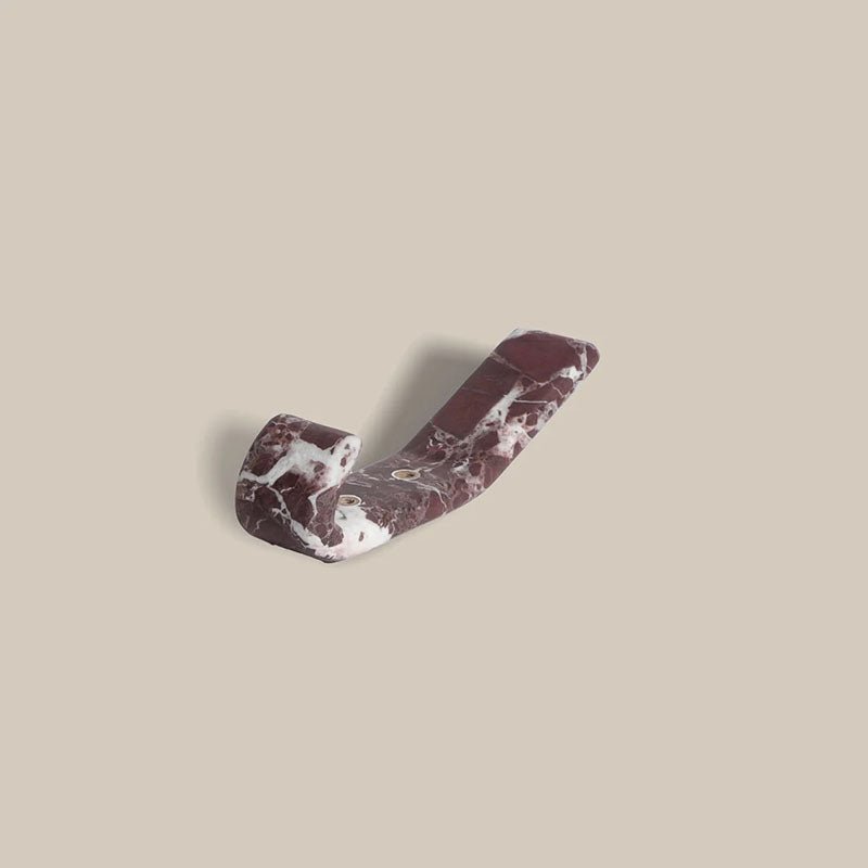 A luxurious and functional wall hook that doubles as a piece of art. This solid, rectangular hook is meticulously carved from Natural White Marble with dramatic Crimson and Russet Veining, making each piece exquisitely unique. It features two elegant, recessed brass or gold-tone mounting points that securely affix it to the wall. Perfect for adding a touch of high-end organic modern style to entryways, bedrooms, or bathrooms, providing a sophisticated hanging solution for coats, bags, or towels.