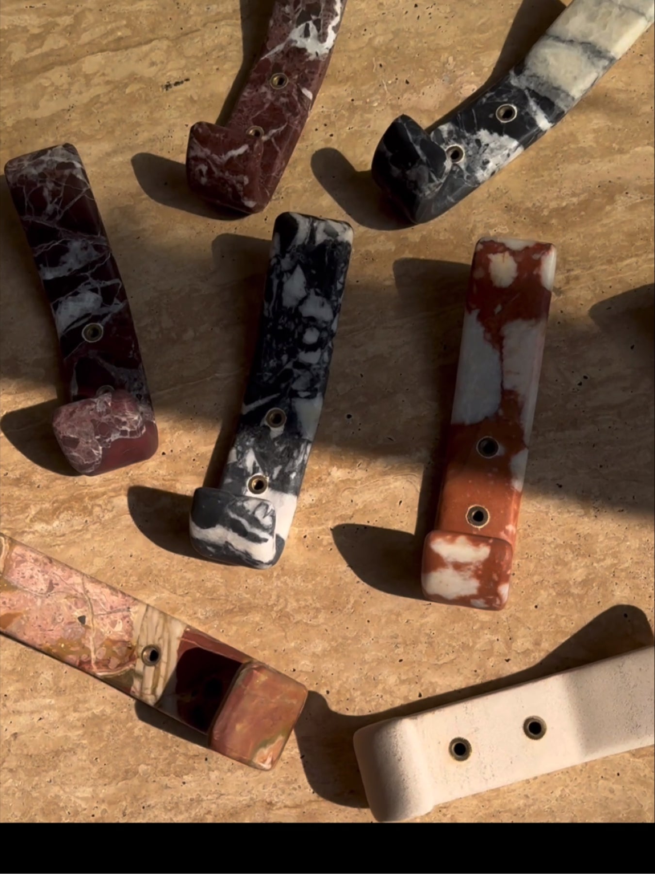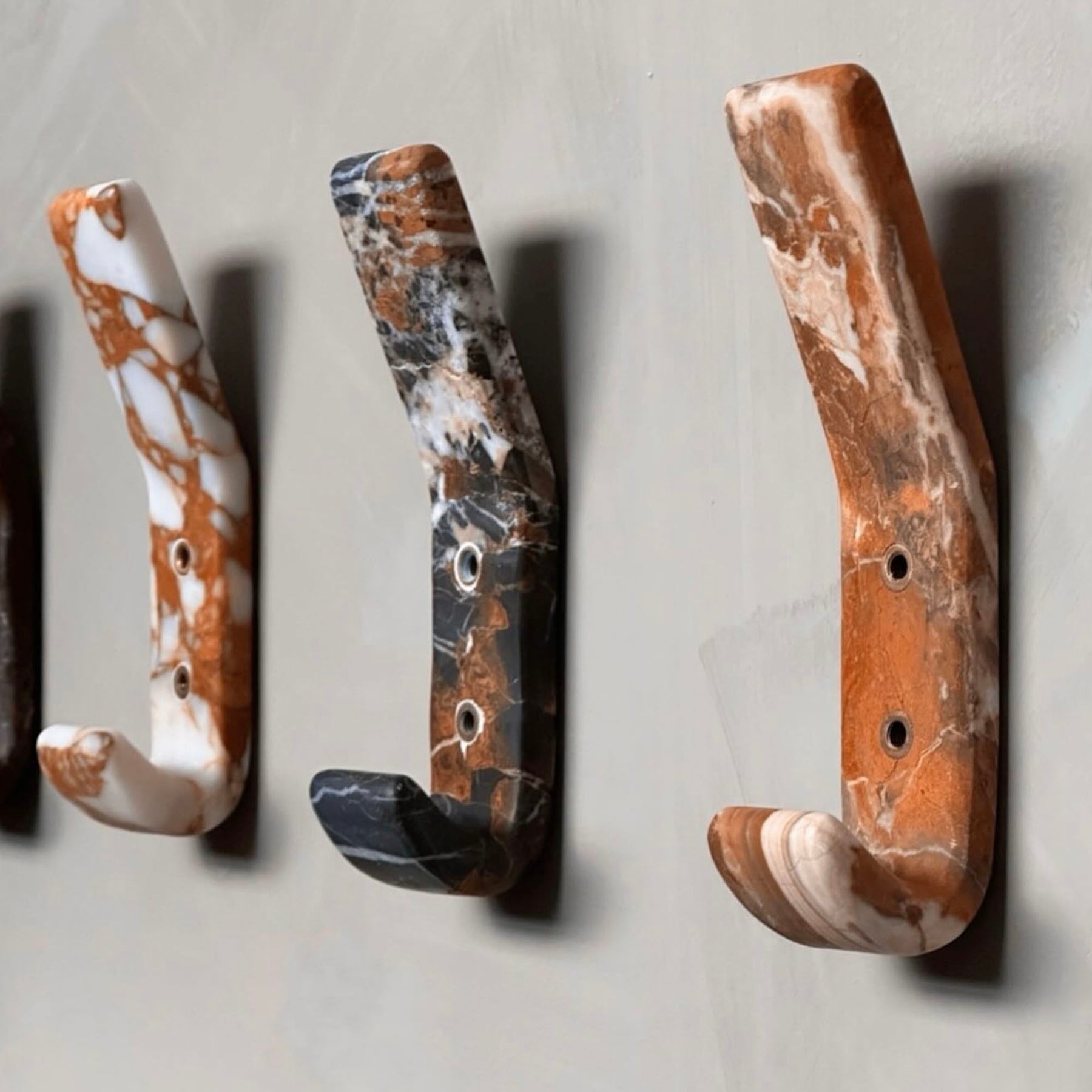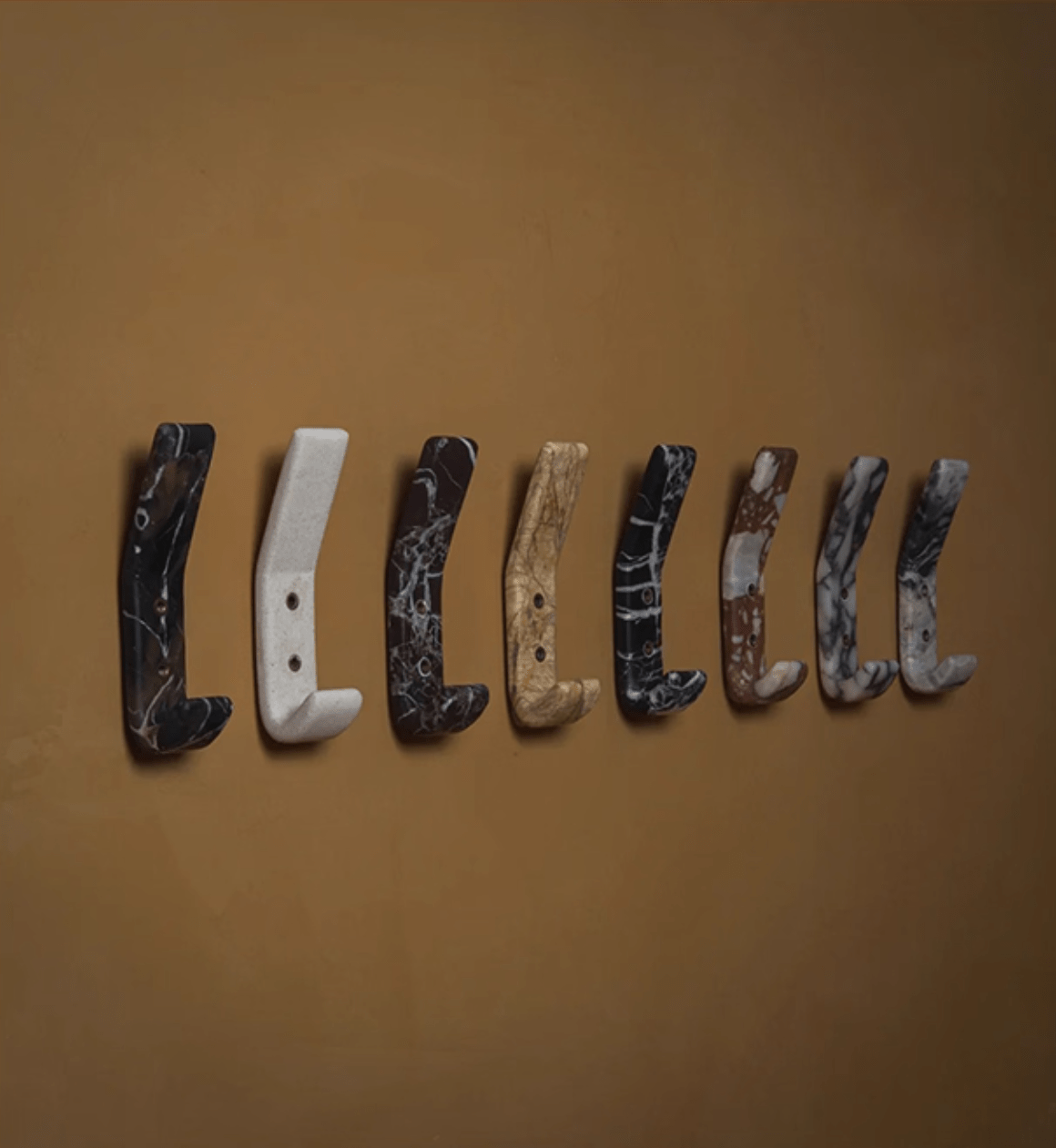 A luxurious and functional wall hook that doubles as a piece of art. This solid, rectangular hook is meticulously carved from Natural White Marble with dramatic Crimson and Russet Veining, making each piece exquisitely unique. It features two elegant, recessed brass or gold-tone mounting points that securely affix it to the wall. Perfect for adding a touch of high-end organic modern style to entryways, bedrooms, or bathrooms, providing a sophisticated hanging solution for coats, bags, or towels.