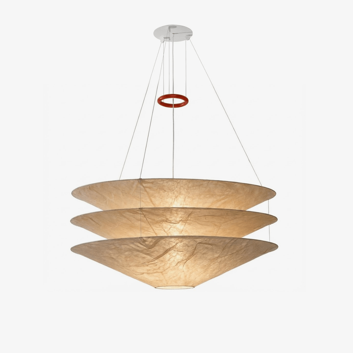 Elevate your space with the serene elegance of the Kazu Cone Pendant Lamp. Crafted with layers of Mulberry silk, this sculptural light features three softly stacked conical forms, suspended with fine tension wires and accented with a striking red loop detail. The result is a visually light yet structurally expressive piece that brings a calming, modern aesthetic to dining areas, entryways, or creative spaces.