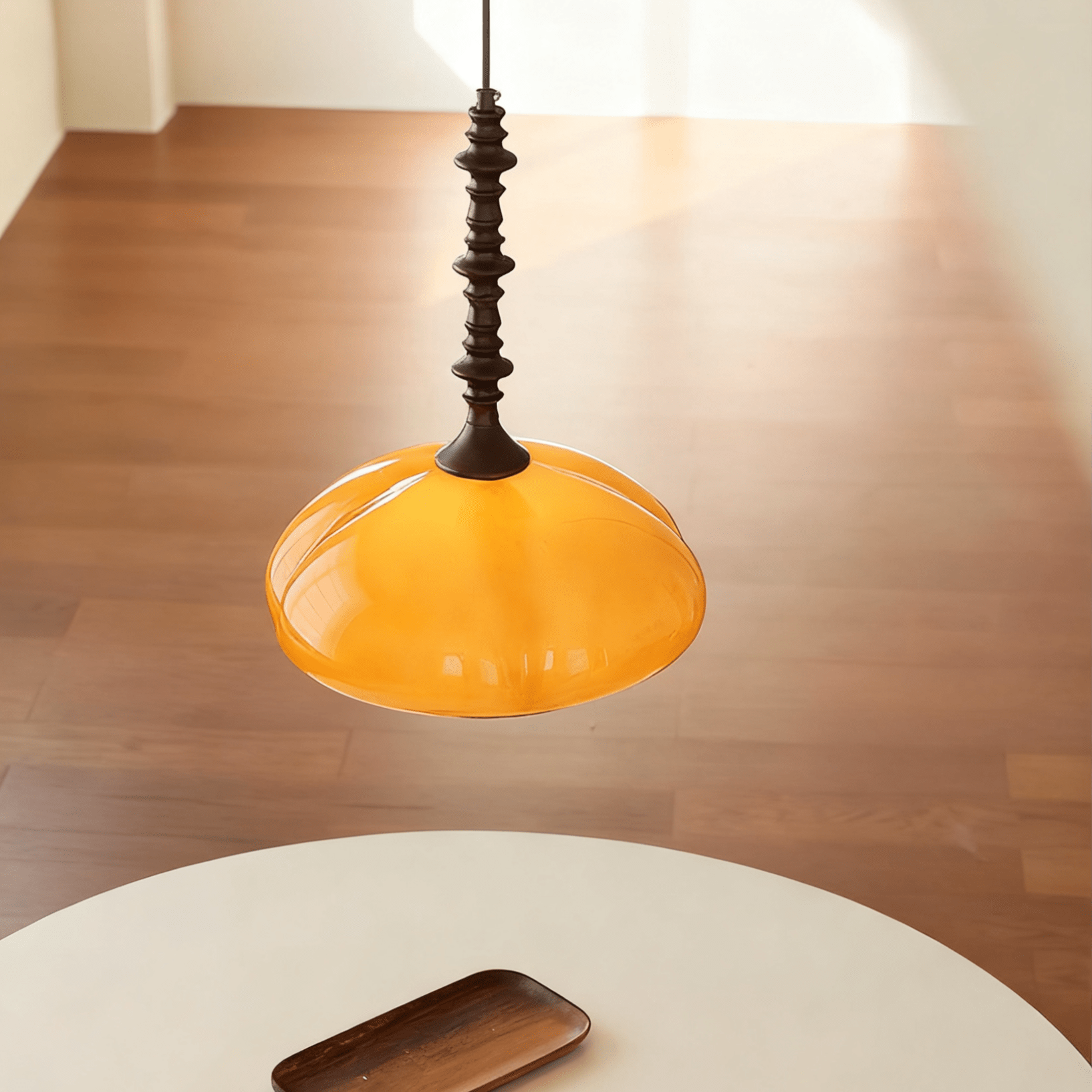 This pendant light features a glossy, citrus - hued dome shade that looks like a blooming flower petal catching the sun's warmth. Matched with a dark, intricately twisted stem and hung by a slim wire, it gives off a cozy, ambient glow. Combining retro charm with artistic style, it's ideal for bringing a unique and welcoming vibe to any space.