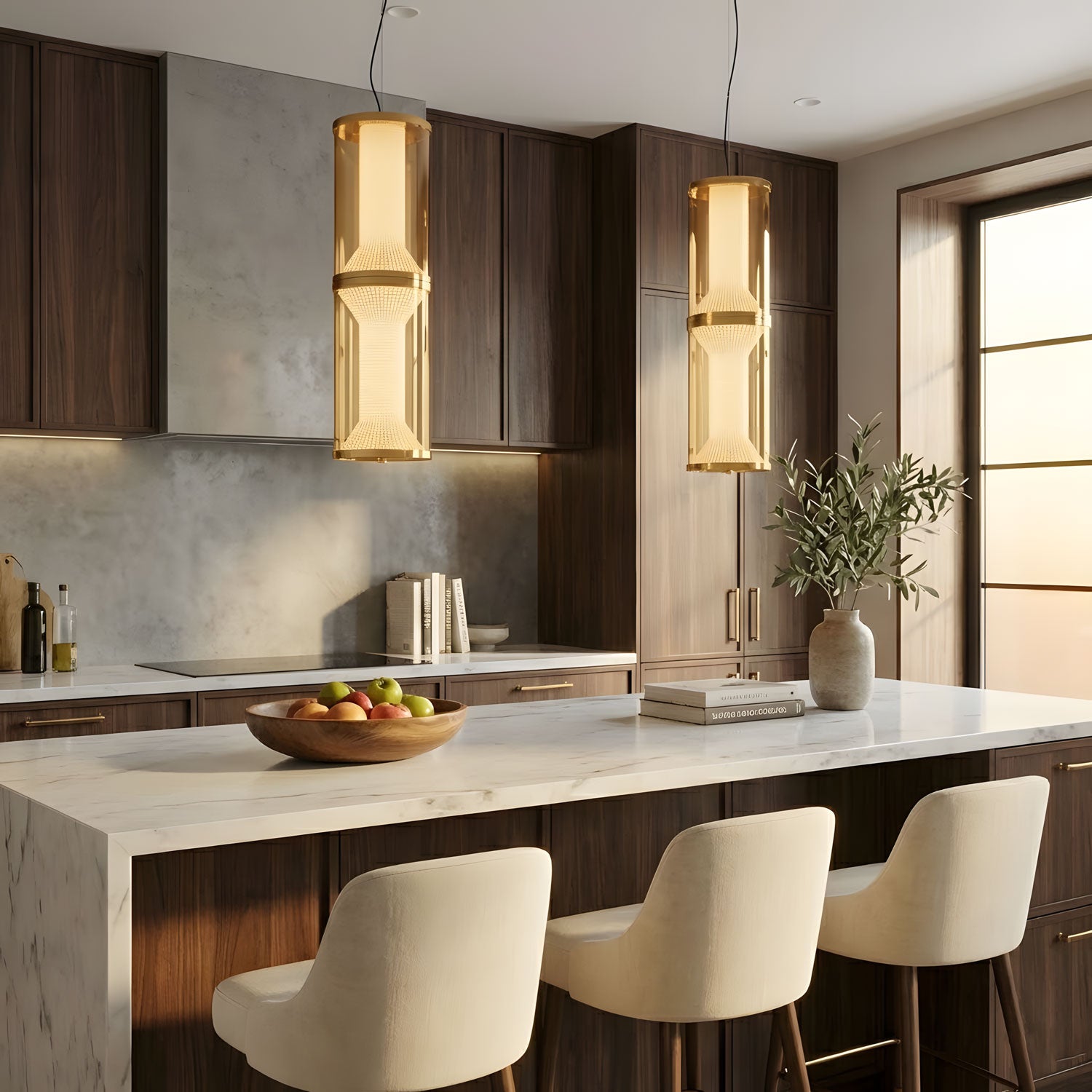 The Miles Pendant Light showcases a series of fluted, horn-like glass forms elegantly suspended within minimalist glass casings. This hand-blown, layered design delivers a dynamic yet balanced visual effect, emitting a warm, inviting glow along its length. Crafted by skilled glassmakers, it serves as a refined statement piece ideal for illuminating dining tables or kitchen islands with understated sophistication.