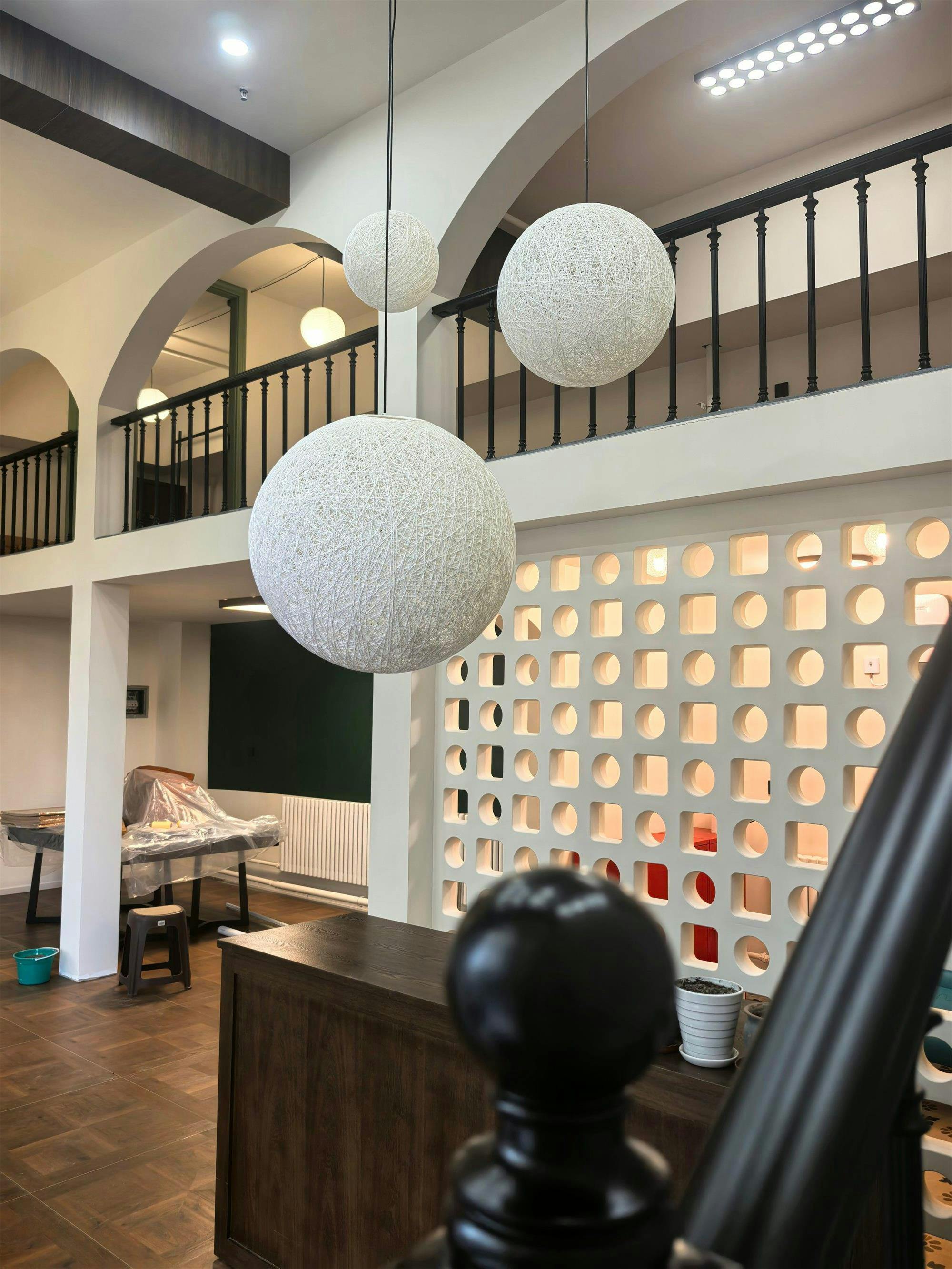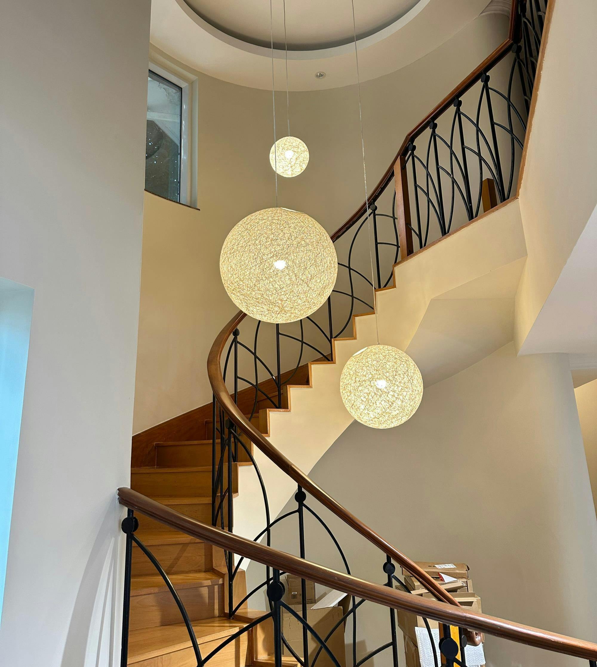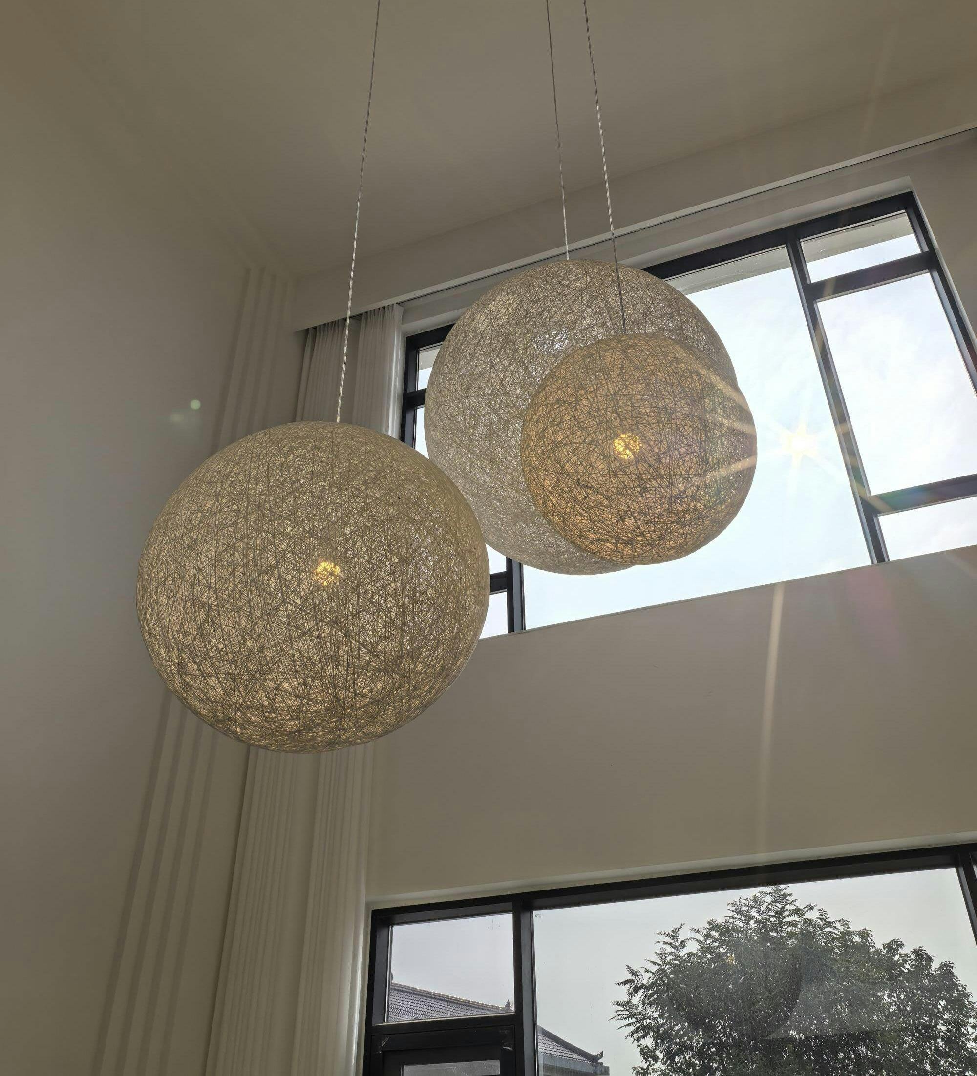 This is a set of spherical woven pendant lights. They feature a unique design with interwoven filaments forming spherical shades, and each has a light bulb inside. Suspended by thin wires, these lights emit a soft glow, adding a modern and artistic touch to the space.
