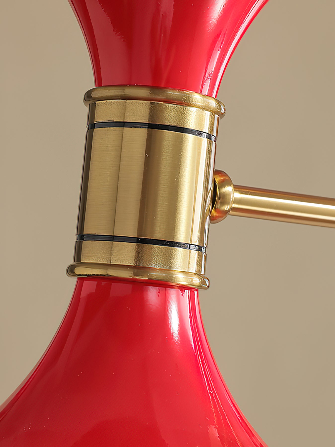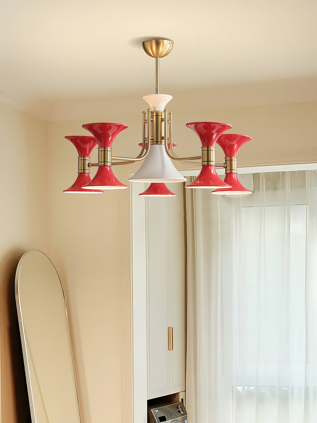 The Tromina Chandelier from Vakkerlight stands out with its iron frame and bold metal shades shaped like red and white trumpets. Its sculptural silhouette channels the energy of mid-century design while offering a playful, modern twist. Both dynamic and refined, this chandelier brings a vibrant focal point to dining rooms, living spaces, or creative interiors that embrace personality and style.