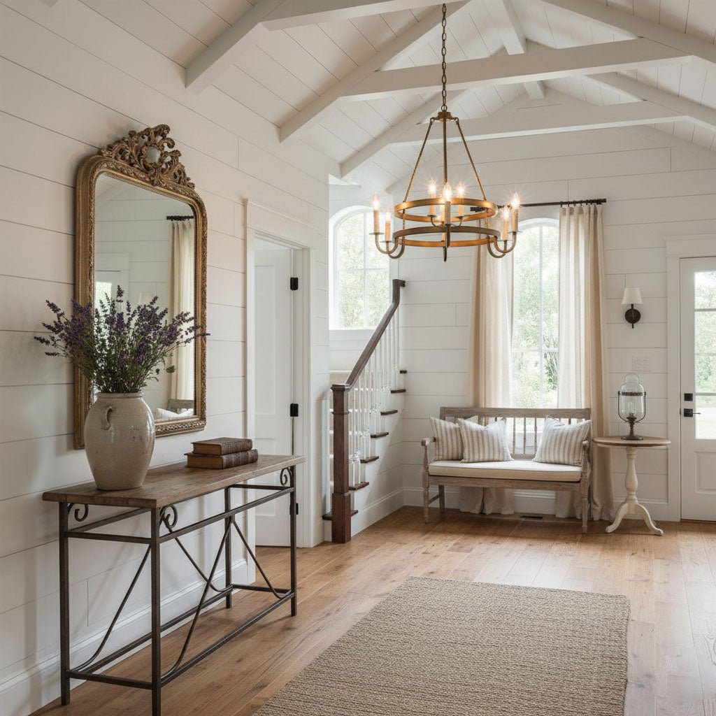 Chandeliers: The entryway is the perfect spot for a statement chandelier. Use the length + width formula to determine the diameter, and ensure the fixture hangs at least 7 feet from the floor to allow clearance.
