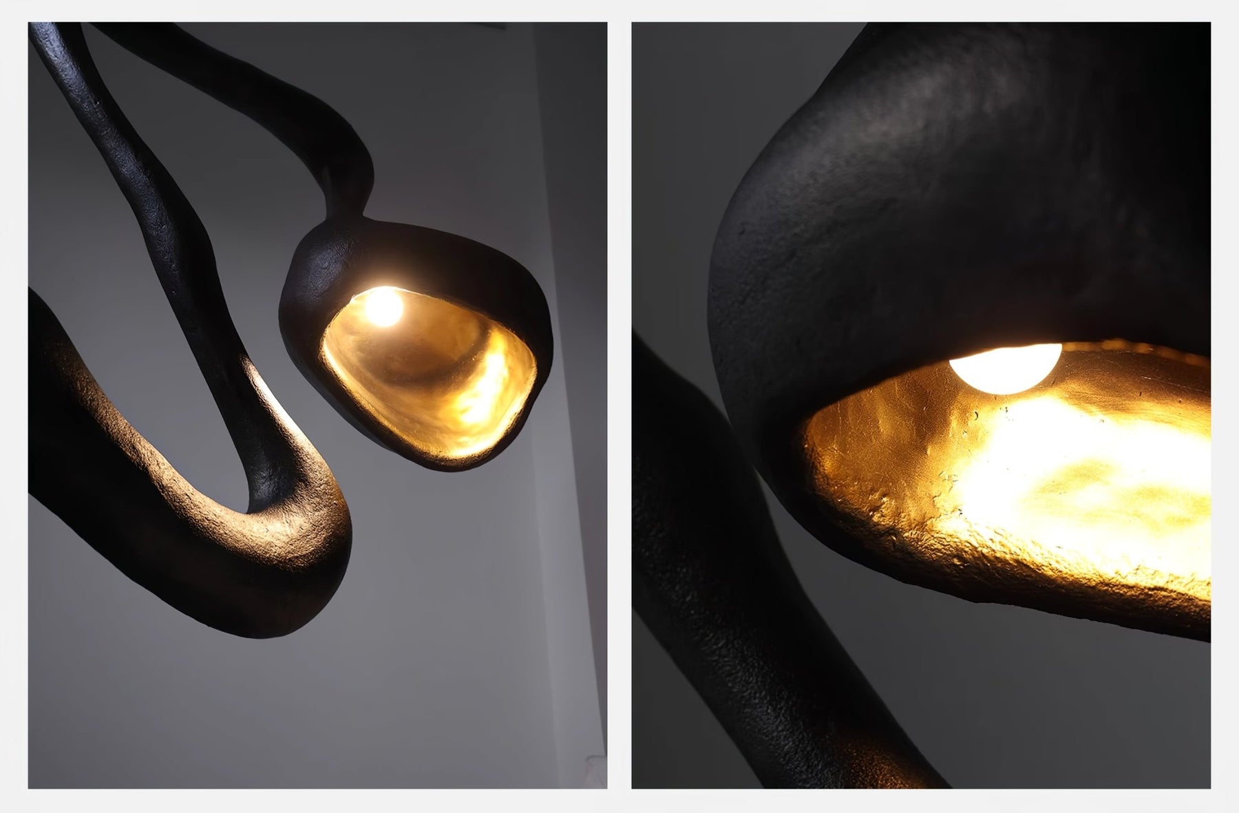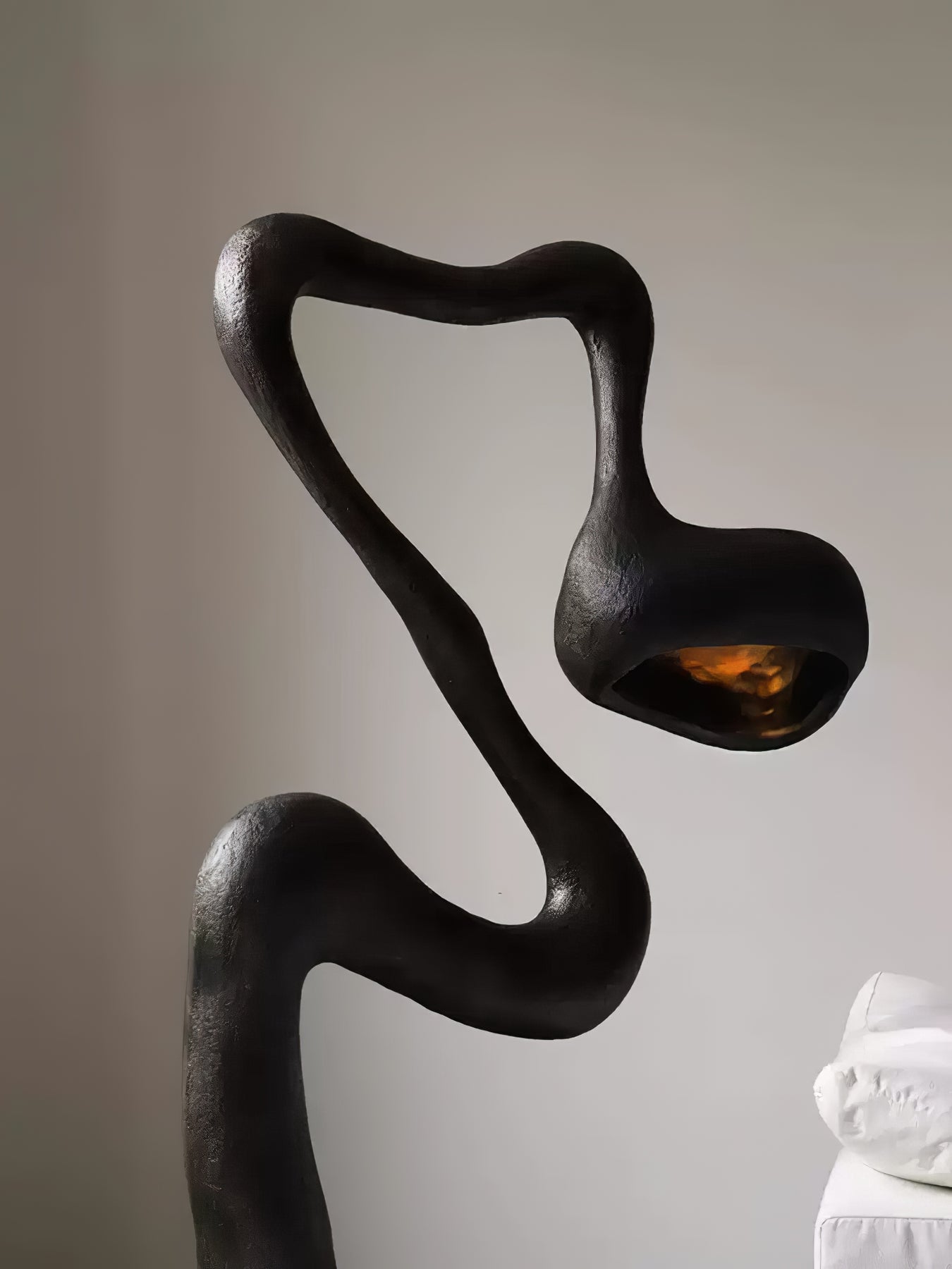 The Myrrh Sculpture Floor Lamp by Vakkerlight is more than a light source—it's a visual poem. Crafted with a flowing, organic silhouette and finished in deep matte charcoal with a golden interior, this sculptural lamp evokes the essence of movement, like molten metal caught mid-pour or a creature emerging from the earth. A dramatic accent for modern art spaces, design-forward interiors, or gallery-like settings, it casts a warm, directional glow that highlights its sensuous curves. Each piece is a statement in form, shadow, and emotion.