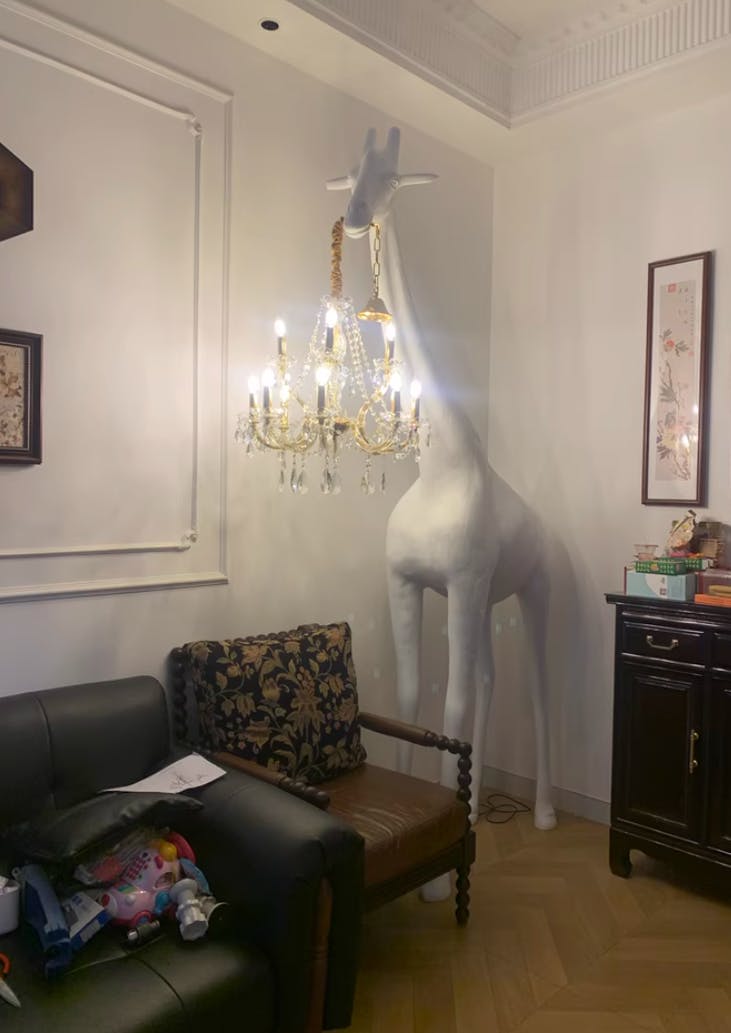 Indulge in the ultimate blend of art and light with the Giraffe Sculpture Floor Lamp, only at vakkerlight. Marvel at the pristine white giraffe, gracefully displaying a luxurious chandelier in its mouth. The intricate crystals and warm candlelight create an ambiance of opulence, elevating any space into a refined exhibit.