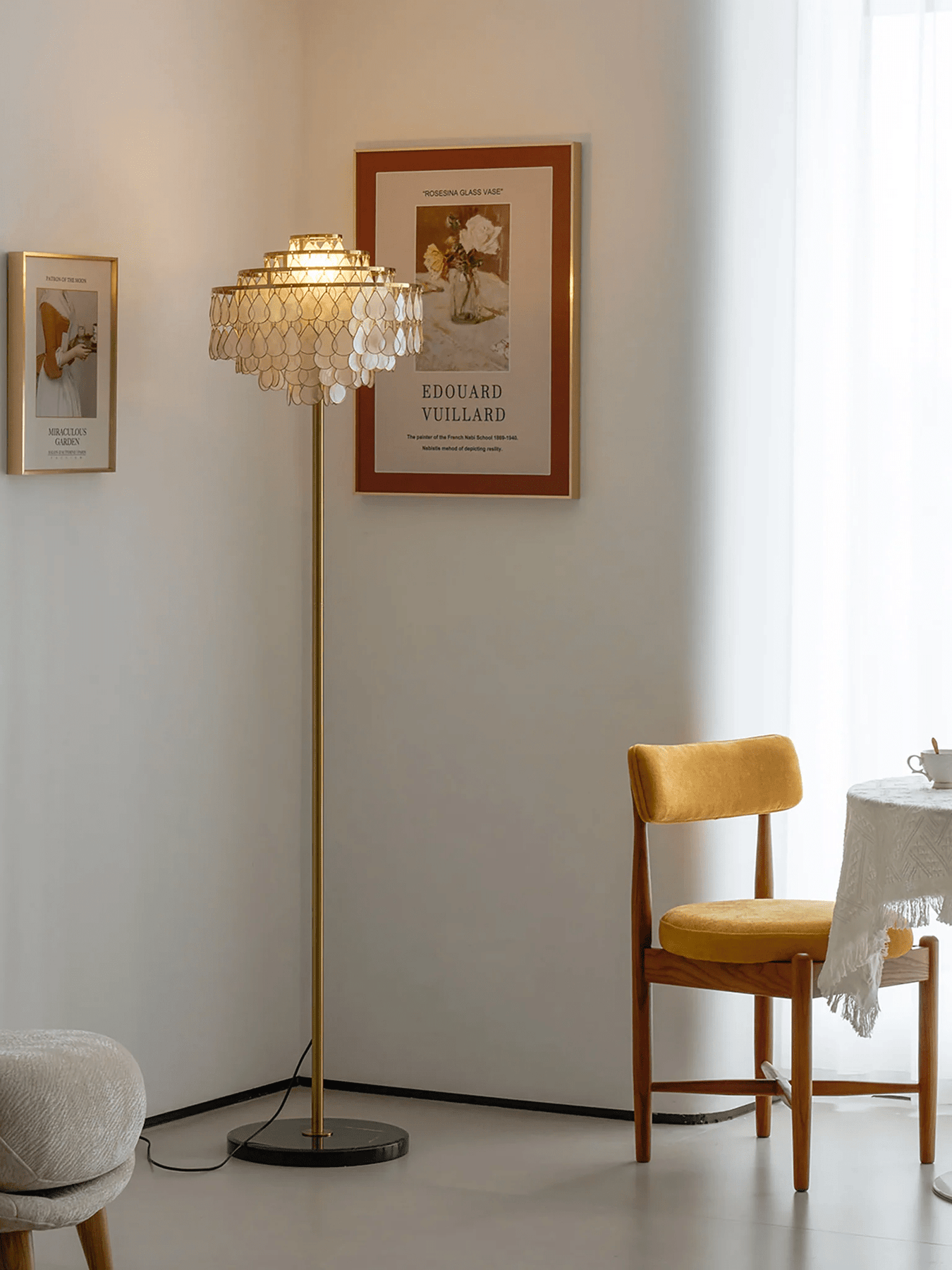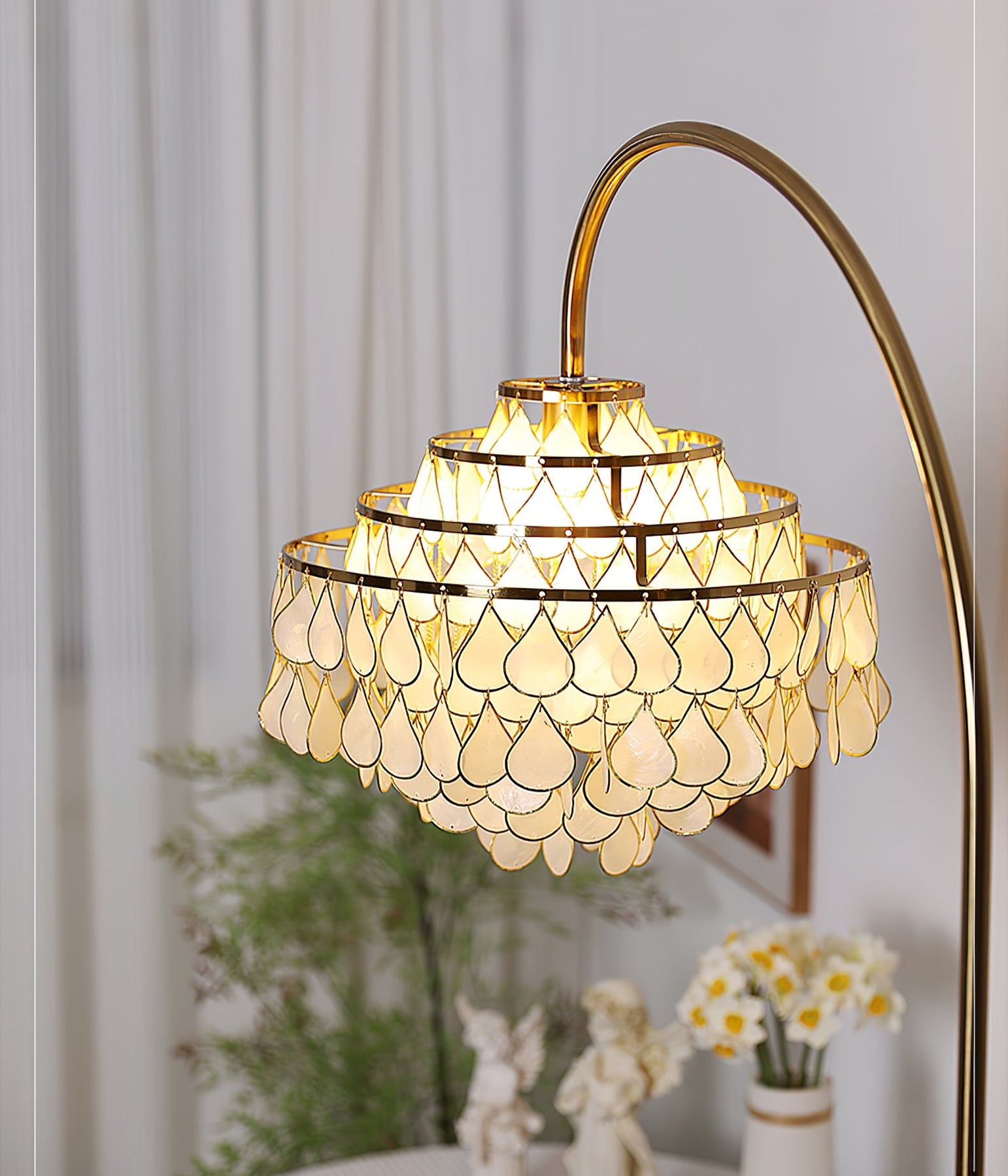 The Shells Floor Lamp showcases a refined golden arc paired with a shade made from authentic Indonesian mother-of-pearl shells, delivering a warm and inviting illumination. Designed for compatibility with dimmer switches, this lamp offers versatile lighting control, enhancing the ambiance of living rooms, bedrooms, or offices with understated elegance and natural charm.