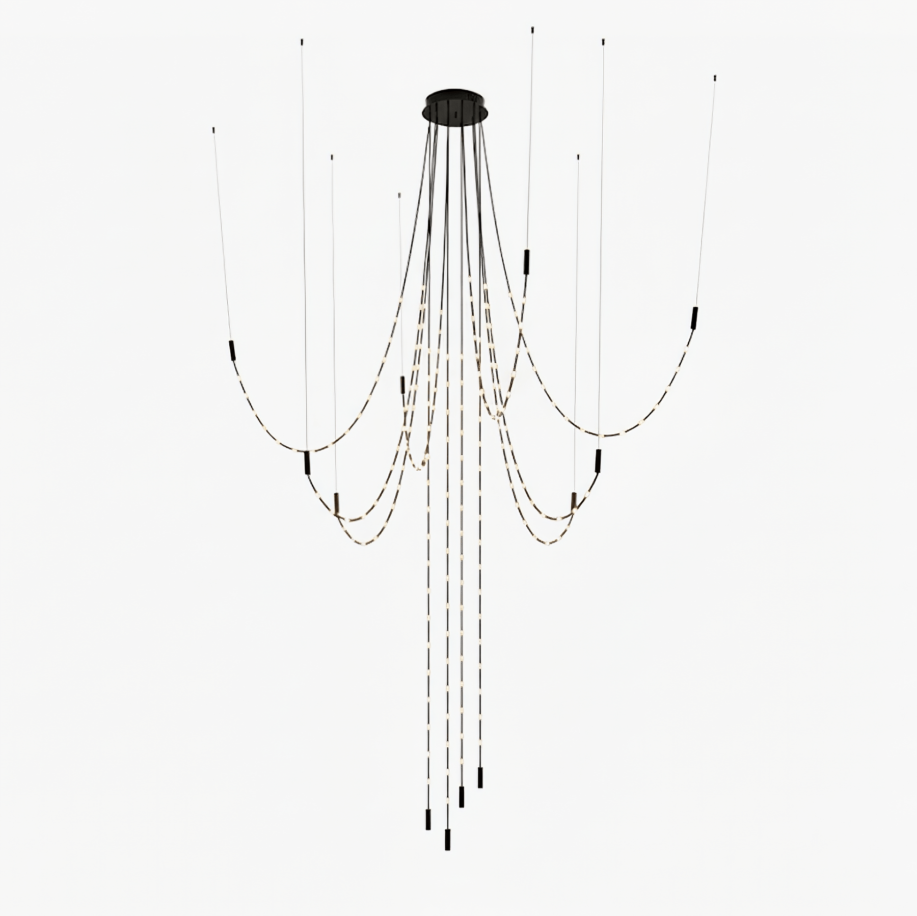 Multidot redefines the traditional chandelier with a contemporary design featuring metal rings that enhance its structural versatility. Suspended from the ceiling, these rings support and shape the light cables, enabling fluid, dynamic forms that evolve visually. Attaching the rings directly to the cables and light spheres creates tension, resulting in sharper, more precise geometries. This combination of elements allows Multidot to blend artistic expression with architectural presence, making it a sophisticated lighting solution for modern interiors.