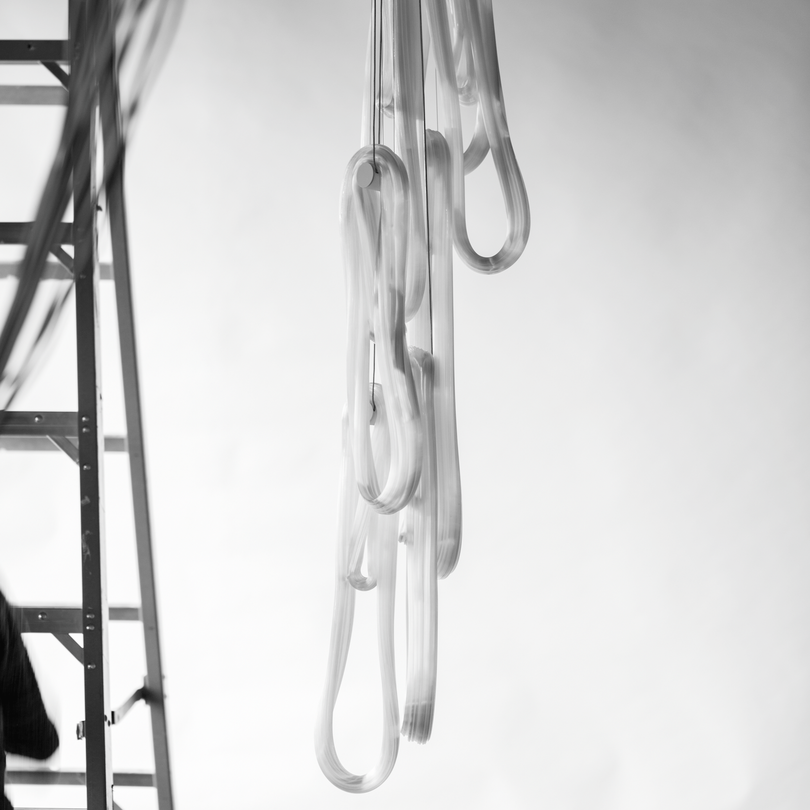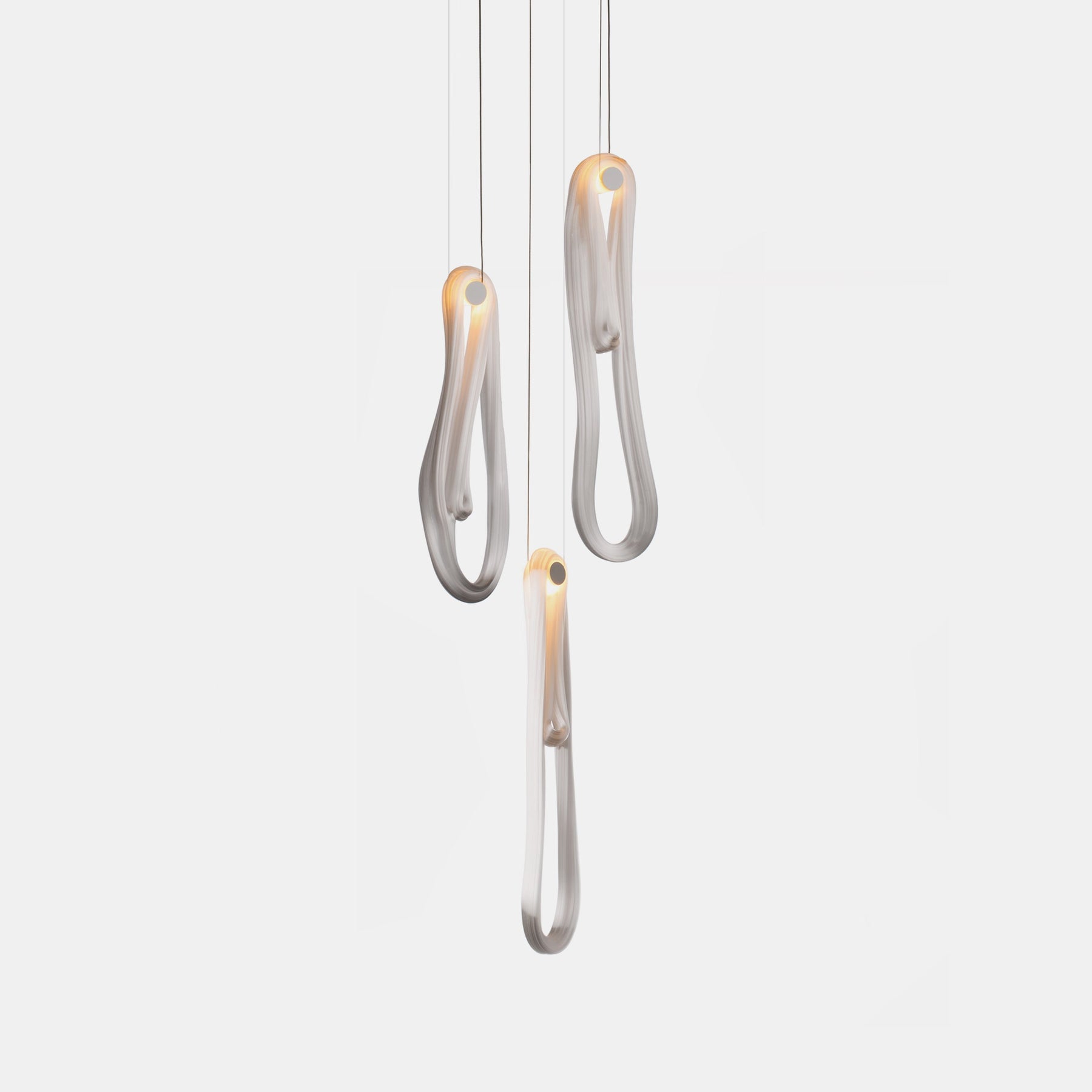 This meticulously crafted glass piece utilizes soda water to trap air within a superheated matrix, which is then vertically stretched and folded repeatedly between pegs. As it cools, the entrapped air transforms into microfilaments along the grain of the loops, imparting a pearlescent optical effect. When illuminated by a low-voltage xenon or LED light source at one end, the microfilaments diffuse light to produce a subtle, elegant gradient, showcasing both advanced glassworking technique and refined optical artistry.