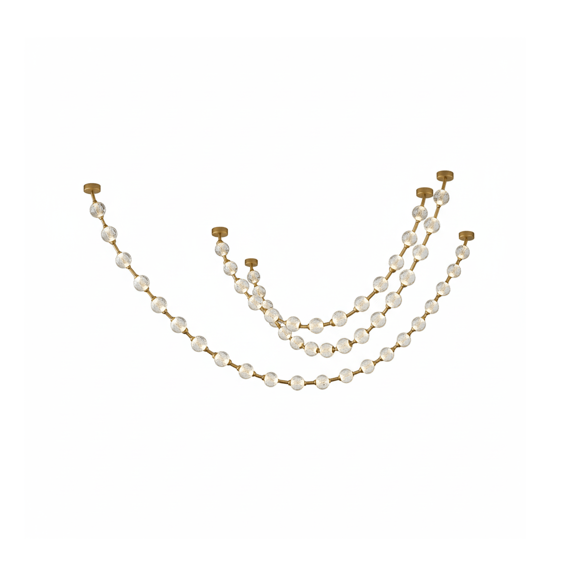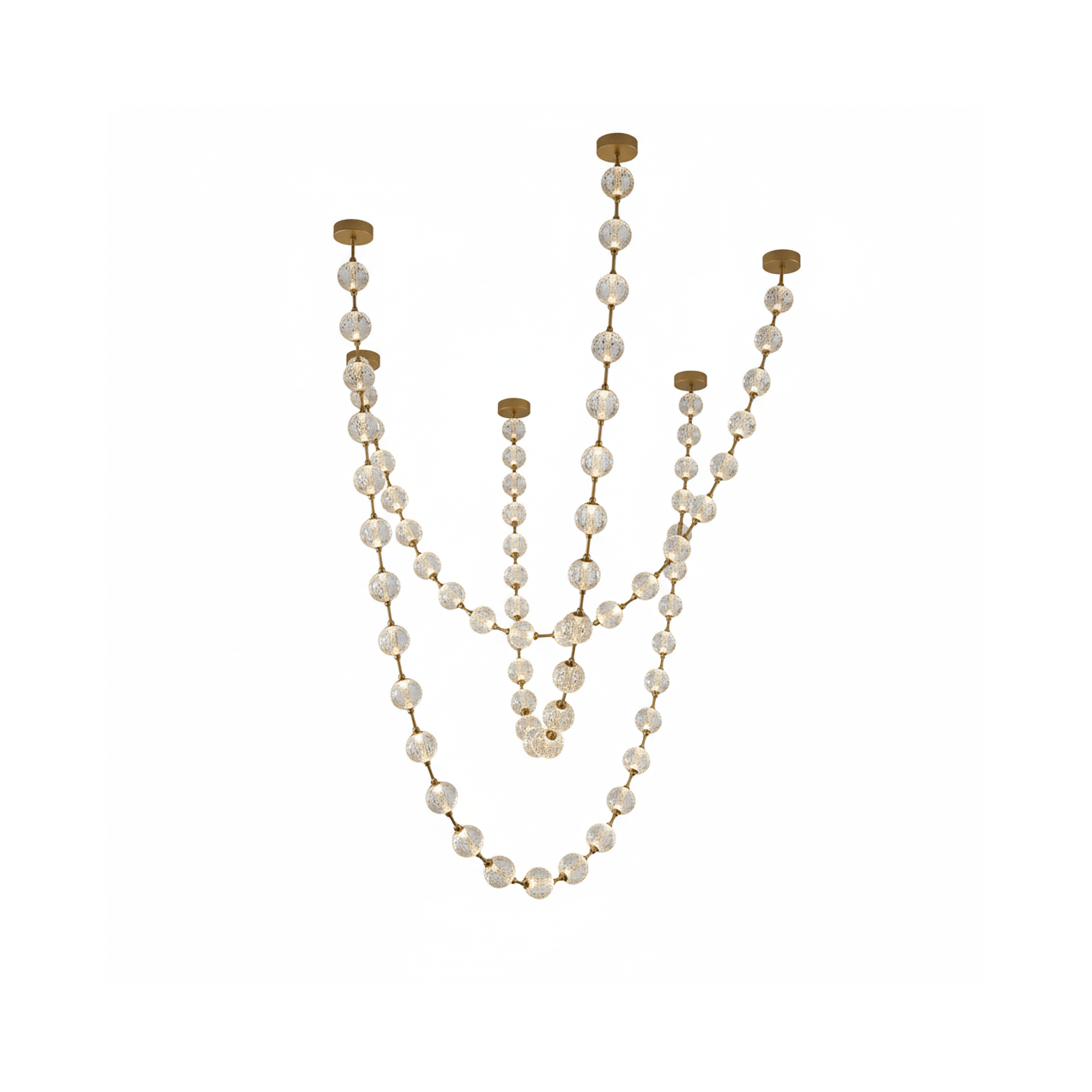 The Celestial Necklace Acrylic Chandelier by Vakkerlight brings the elegance of fine jewelry into the world of lighting design. Inspired by the graceful drape of a luxurious necklace, this chandelier features cascading strands of textured acrylic spheres, delicately connected by golden metal links. The semi-transparent acrylic globes emit a radiant, diffused glow, creating a striking visual effect while remaining lightweight and versatile. Ideal for dining areas, stairwells, or high-ceiling spaces, this piece combines the glamour of a statement necklace with the function of modern illumination — a perfect blend of art, light, and elegance.