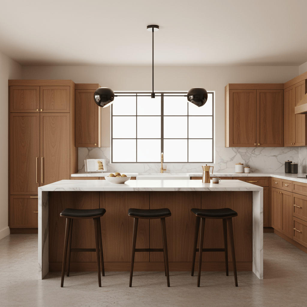 Pendants Over Island: These provide crucial task lighting for food prep and should hang 32-36 inches above the surface. Make sure that each pendant is about 1/4 the length of the island to provide sufficient coverage without overwhelming the space.