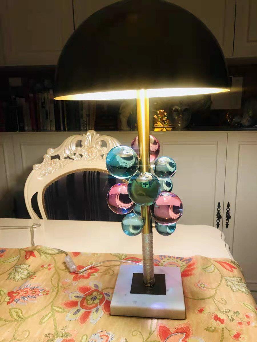 The sensational Globo Table Lamp by Vakkerlighting features a constellation of glass spheres that float on a slender Copper stem anchored by a sculptural marble base and topped with a brass dome. The dazzling shade refracts the light, makes the acrylic sparkle, and creates a lovely glow for warming your interior space.