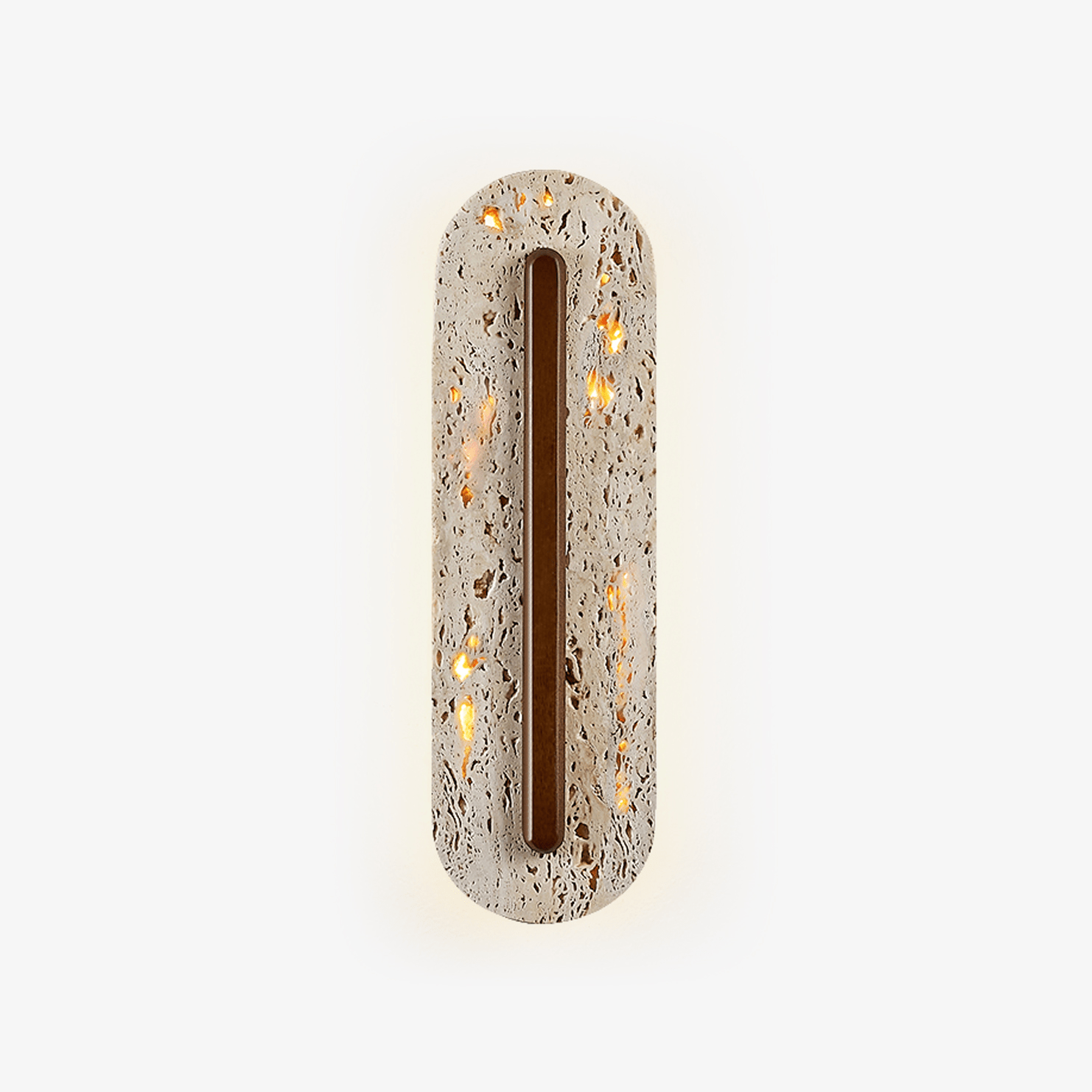 The Aerin Lumaslot Wall Lamp pairs natural travertine with a refined vertical light channel, creating a warm, sculptural glow. Soft illumination escapes through the stone’s organic pores while the centered slot forms a clean architectural line. Its elongated oval silhouette feels modern yet earthy, making it a striking accent for hallways, entryways, and serene contemporary interiors.