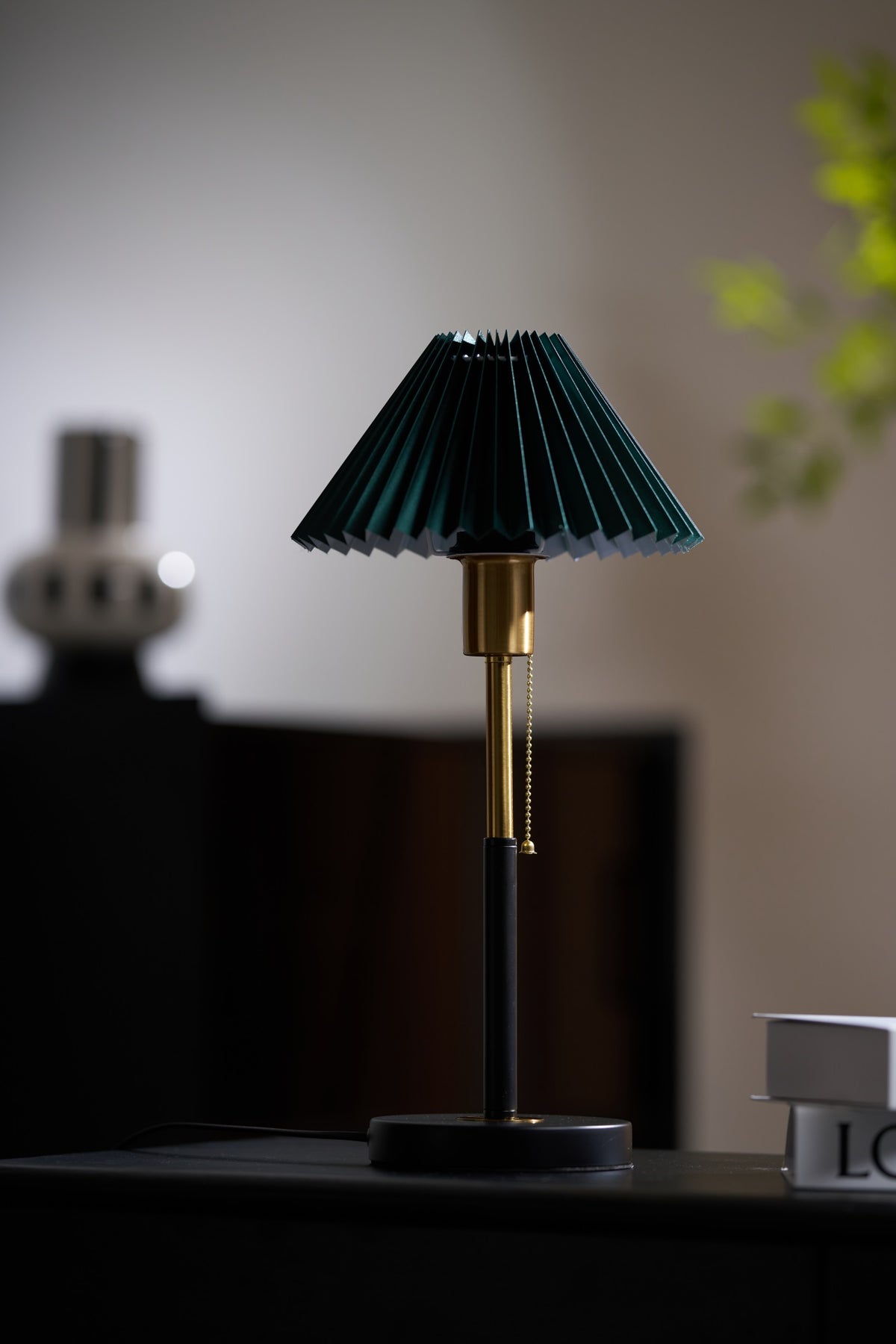 Verleihen Sie Ihrem Raum mit der Lumi Pleated Tischleuchte einen Hauch zeitloser Eleganz. Mit ihrem üppigen, samtigen Plisseeschirm in tiefem Waldgrün verbindet diese Lampe Vintage-Charme mit moderner Schlichtheit. Der Sockel aus Messing und schwarzem Metall sorgt für einen raffinierten Kontrast und macht sie zum perfekten Akzent für Schreibtische, Nachttische oder Leseecken.