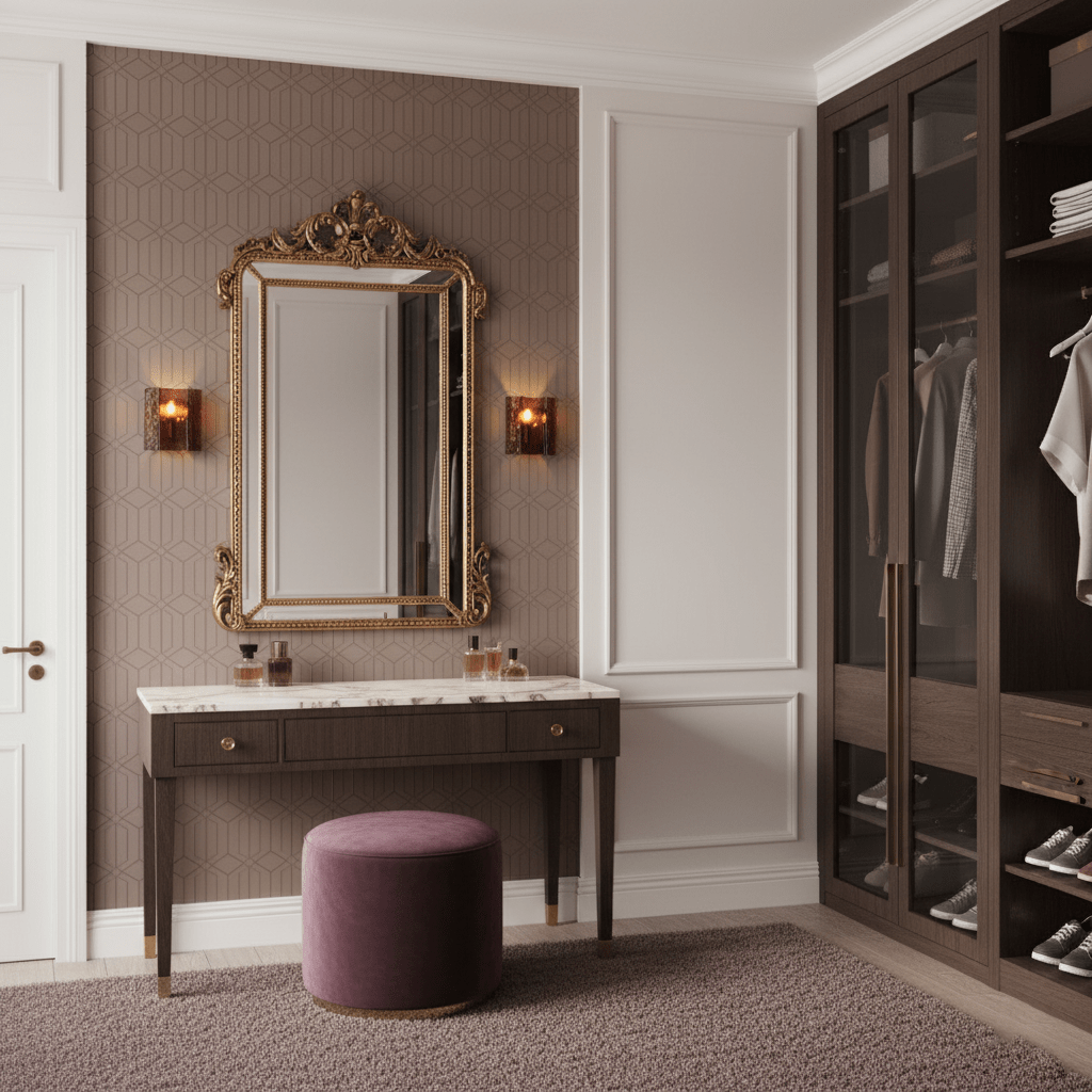 Schminktischbeleuchtung : Platzieren Sie zur Arbeitsbeleuchtung Wandleuchten auf beiden Seiten des Kosmetikspiegels, um Schatten zu minimieren. Diese sollten 165 bis 180 cm über dem Boden angebracht und für eine gleichmäßige Beleuchtung ausreichend verteilt sein.