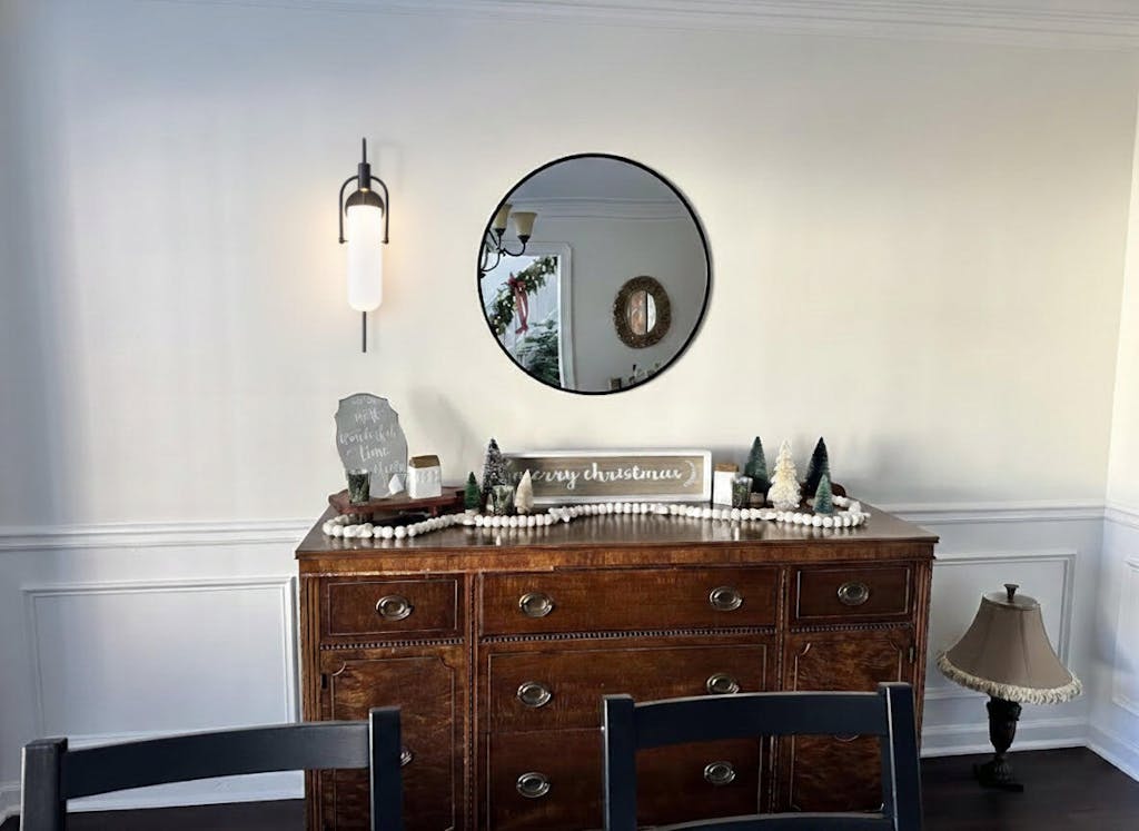 Schminktischbeleuchtung : Platzieren Sie zur Arbeitsbeleuchtung Wandleuchten auf beiden Seiten des Kosmetikspiegels, um Schatten zu minimieren. Diese sollten 165 bis 180 cm über dem Boden angebracht und für eine gleichmäßige Beleuchtung ausreichend verteilt sein.