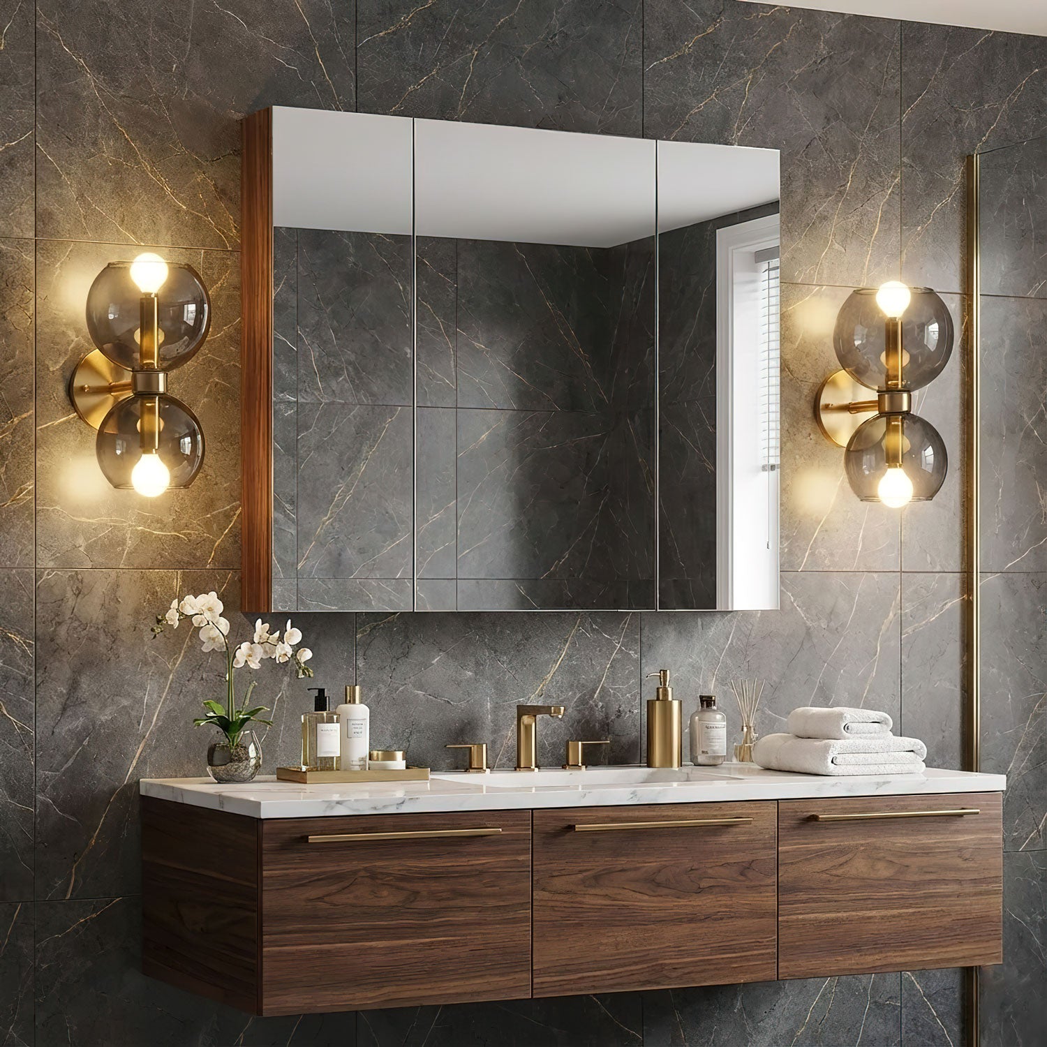 Schminktischbeleuchtung : Platzieren Sie zur Arbeitsbeleuchtung Wandleuchten auf beiden Seiten des Kosmetikspiegels, um Schatten zu minimieren. Diese sollten 165 bis 180 cm über dem Boden angebracht und für eine gleichmäßige Beleuchtung ausreichend verteilt sein.