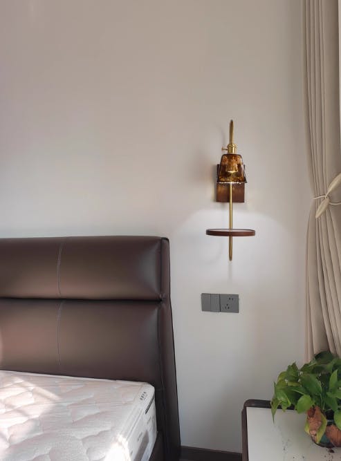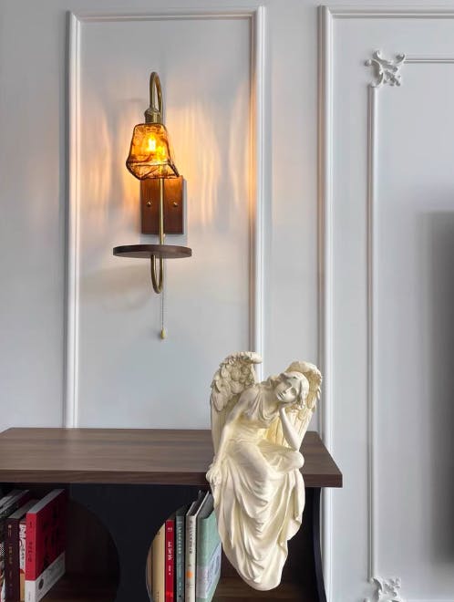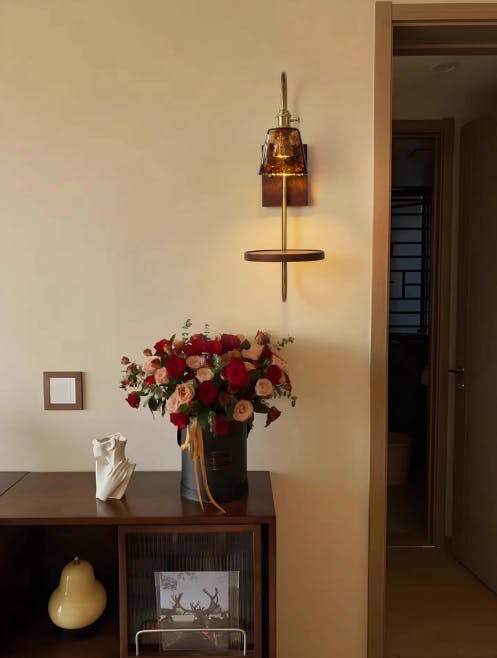 Die Walnuss-Regalwandleuchte verbindet klassisches Design mit moderner Funktionalität. Mit einer edlen Walnuss-Rückplatte und einem schlanken Messingarm verfügt diese Wandleuchte über ein integriertes Regal, ideal für kleine Utensilien. Der Glasschirm, erhältlich in Bernstein und Weiß, verbreitet warmes, einladendes Licht und schafft eine gemütliche Atmosphäre in jedem Raum. Ideal für Nachttische oder Wohnbereiche, erhellt die Walnuss-Regalwandleuchte nicht nur Ihr Interieur, sondern wertet es mit ihrem eleganten und praktischen Design auch optisch auf.