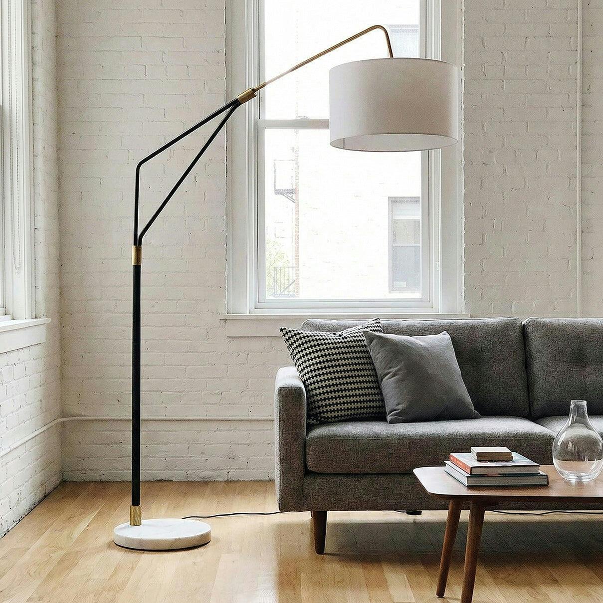Die Fulton Stehleuchte besticht durch ihren übergroßen Leinenschirm, der an einer abgewinkelten, goldfarbenen Eisenstange hängt. Der runde Marmorsockel weist den charakteristischen weißen Hintergrund mit hellgrauer Maserung auf und verleiht diesem modernen Stück einen eleganten, soliden Akzent.